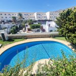 The owners in Pueblo del Cantal enjoy a lovely communal pool surrounded by lawns, ideal for relaxing in a peaceful setting after a day at the beach.
