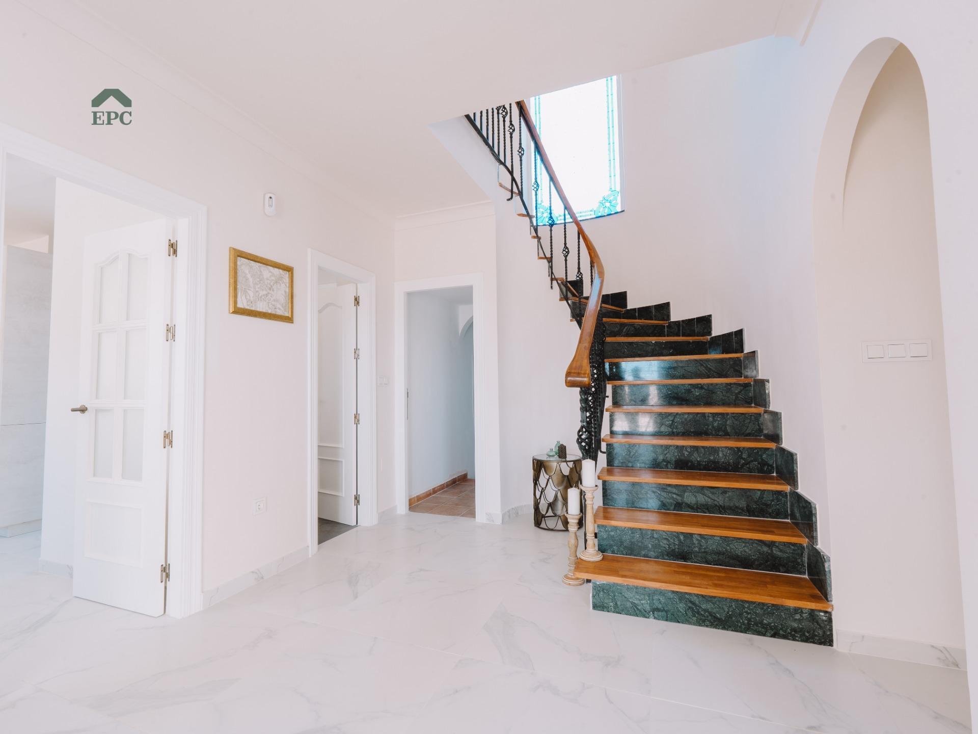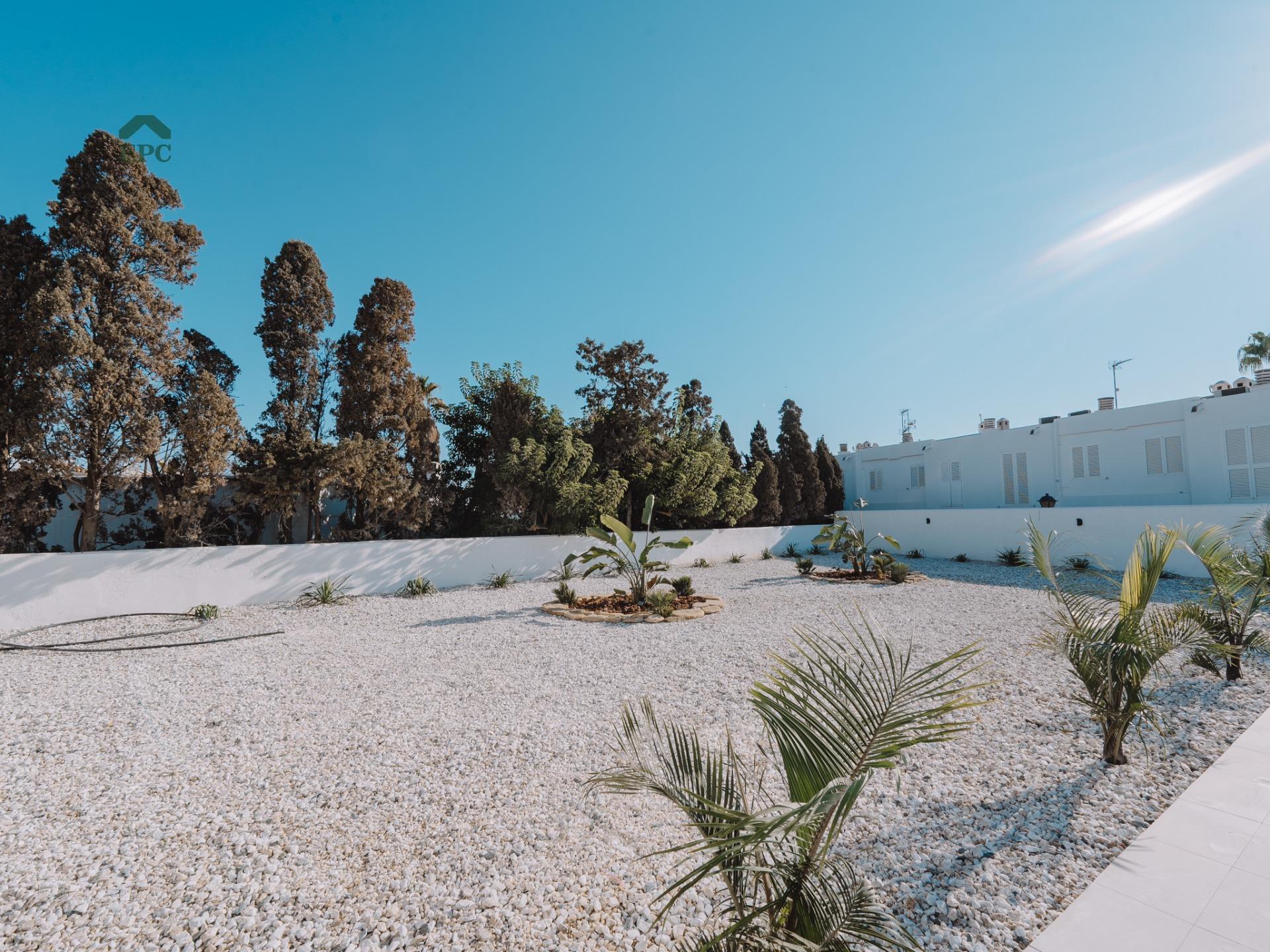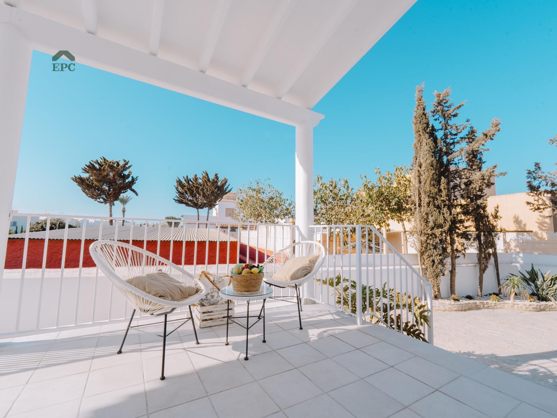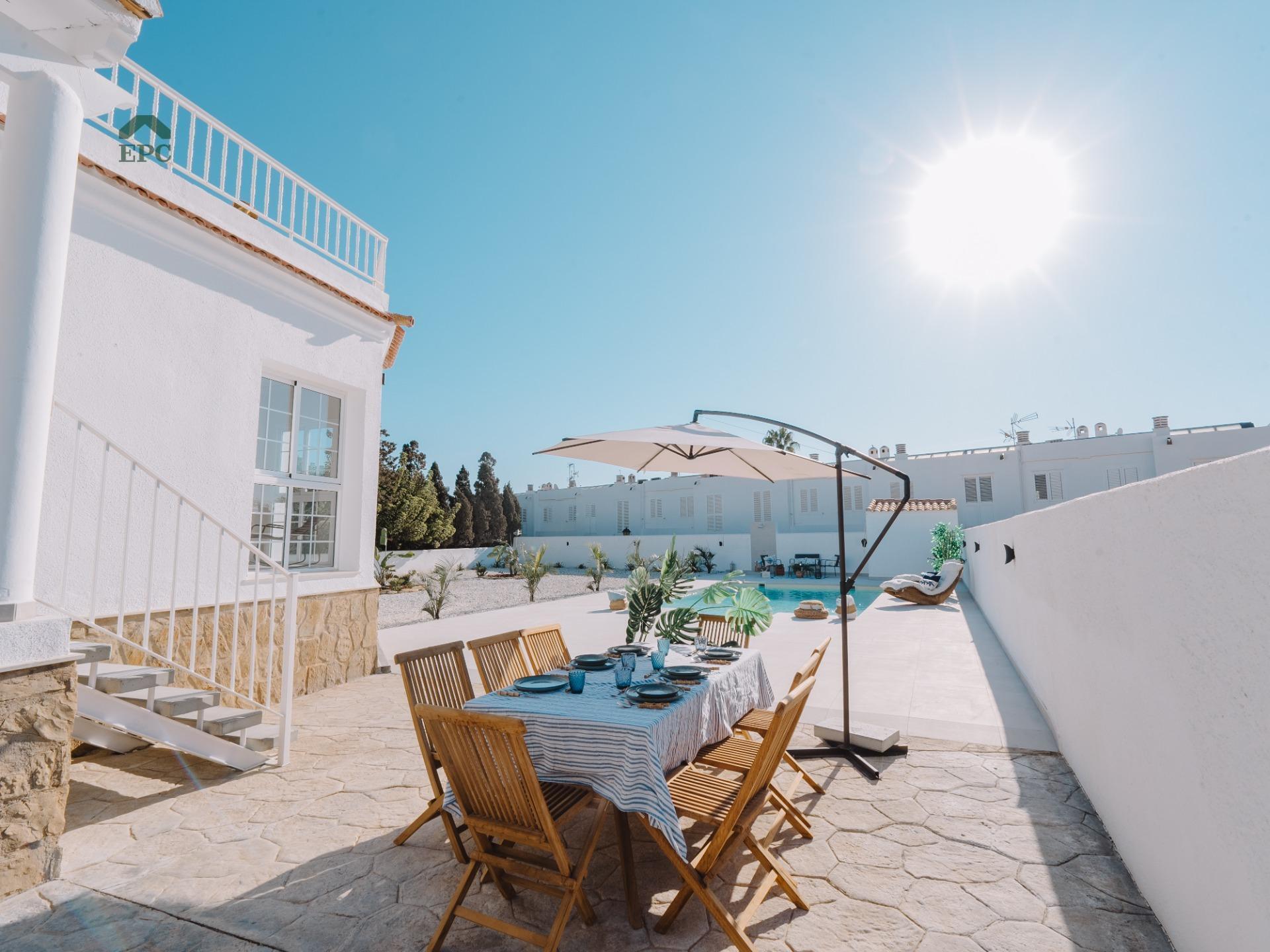 In the heart of Mojácar Playa, in the El Palmeral area on Calle Vendaval, lies a property that combines luxury, Mediterranean tradition, and a modern lifestyle. This recently renovated villa is not only an exceptional real estate opportunity but also a reflection of the charm that makes Mojácar such a special place for those seeking the best of the Mediterranean.~~This 447 m² villa, set on a 1,100 m² plot, harmonizes rustic elements with contemporary touches, capturing the essence of Mojácar as it evolves. The home has been fully renovated and stands out for its brightness, spaciousness, and spectacular views. The large windows in the living room frame the newly opened pool, while the elegant porcelain floors add a sophisticated touch, perfect for those who appreciate refined design.~~Mojácar offers an exceptional quality of life, and this villa is no exception. With five bedrooms, three bathrooms, and a guest toilet, the property ensures space and comfort. The bright living room and modern kitchen with a breakfast bar invite family moments. Additionally, the terrace overlooking the pool and the 40 m² solarium with spectacular sea views, just a 5-minute walk away, are perfect for relaxation and enjoying the surroundings. The 185 m² basement, ideal for vehicles or storage, adds functionality and exclusivity to this investment.~~The property also includes a separate guest or service house, with a living room, kitchen, one bedroom, and a full bathroom, adding privacy and versatility.~~Surrounded by a 600 m² garden with palm trees and a luxurious private pool, this villa is an oasis of tranquility in the heart of the Mediterranean, ideal for enjoying the climate and serenity of the region.