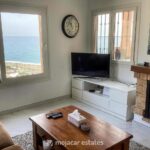 The main entrance leads into a bright and spacious living room with air conditioning and fireplace, creating a comfortable year-round living space. An archway connects the sitting room with the dining area and open plan kitchen, which features white units and black Silestone worktops. From the dining area there is direct access to a terrace with outstanding sea views, fitted with an awning and space for outdoor dining. From here, a metal staircase leads up to a private roof terrace (solarium) with panoramic coastal views, shared only with the discreetly positioned solar panels.