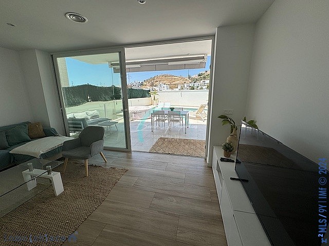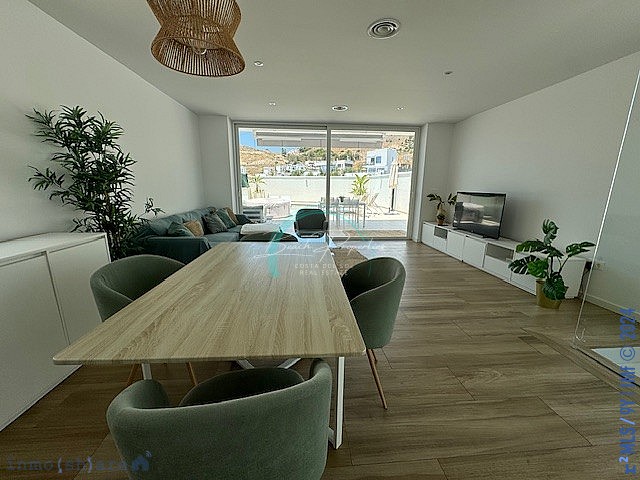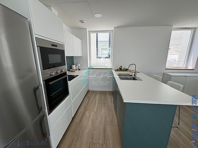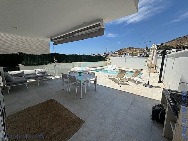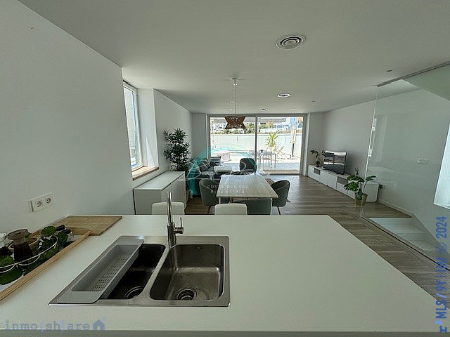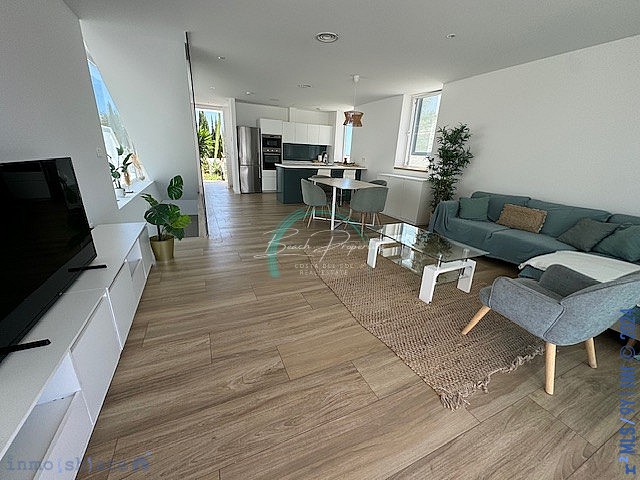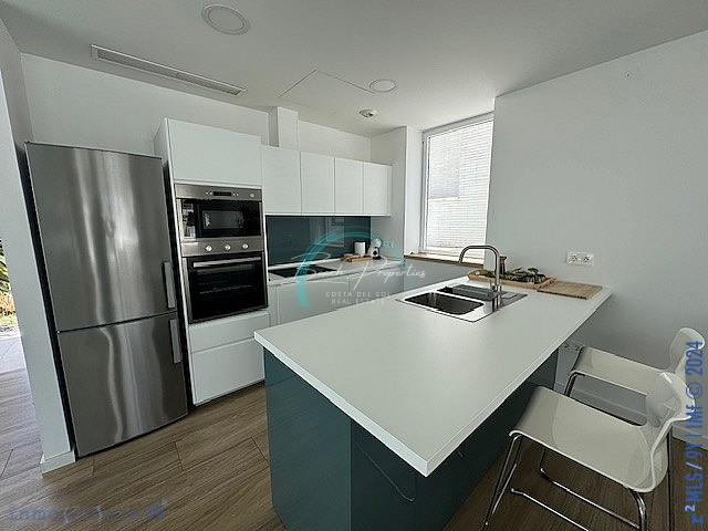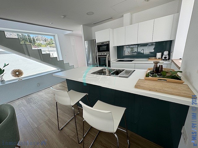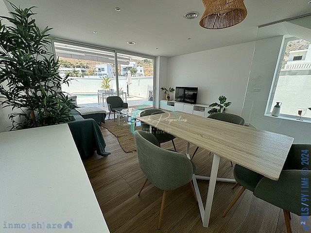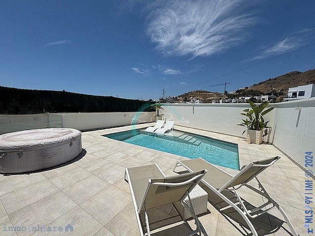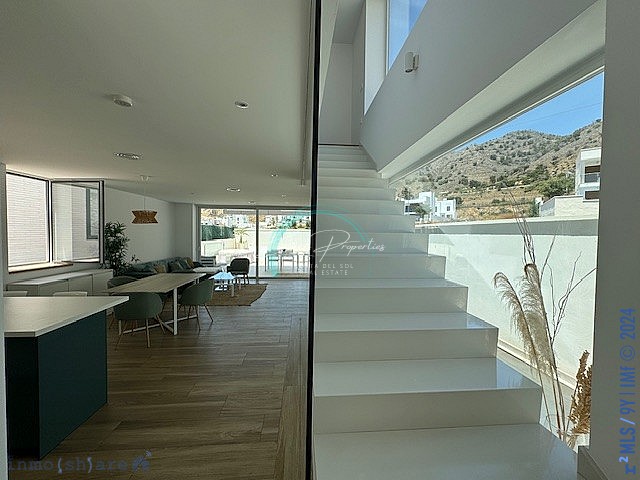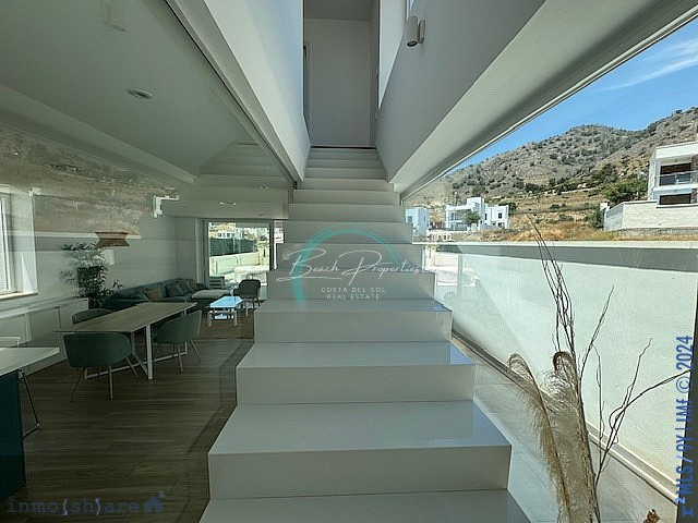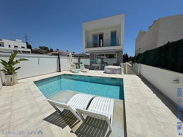 Stunning property. Just contructed, but resale already! Three bedrooms, two full bathrooms, one toilet. Fully equiped kitchen, saloon, terraces and garage in three floors, constructed area is 229 m2, inside living space of 207 m2. The entrance from the street leads to a small and private garden, later on few steps goes to a hall with an toilet on your left. You will directly meet very bright and comfortable ambient. the hall leads to a saloon with open-plan kitchen. From saloon you will enter to a large terrace with swimming pool partly roofed. Private spacious space with lovely open mountain view. In second floor there are two bedrooms, the main one with unbeatable sea view and spacious bathroom with whirlpool. In the basement there is a garage with an automatic electric gate, one more bathroom and enough space to make one more bedroom or even apartment (as it has an independent entrance) or gym. The house disposes of solar panels. All the windows and cristal doors have double glazing. There is thermic isolation system exterior. A/C cooling/heating in the whole space. Opportunity !!! Book your viewing soon !!
