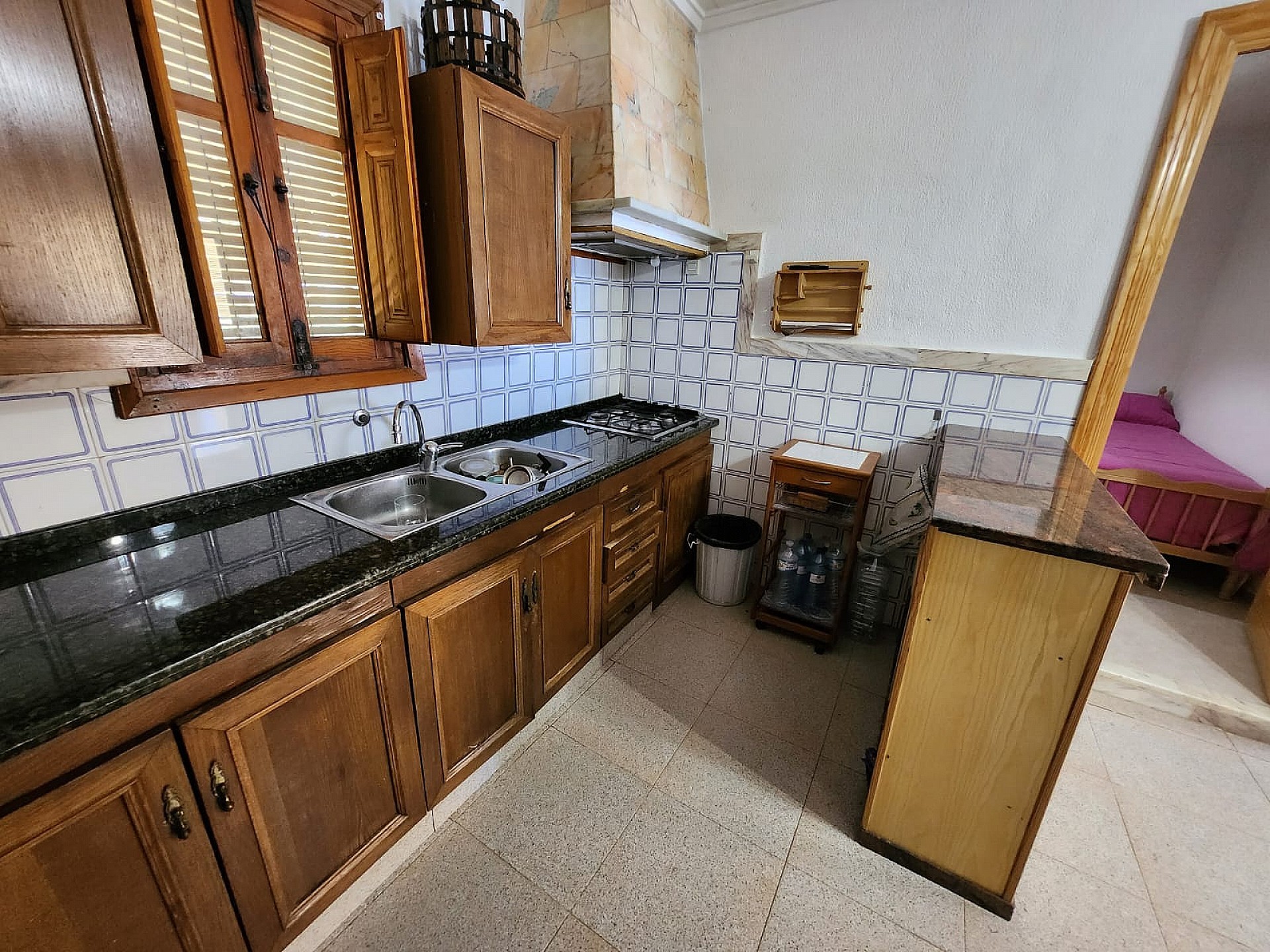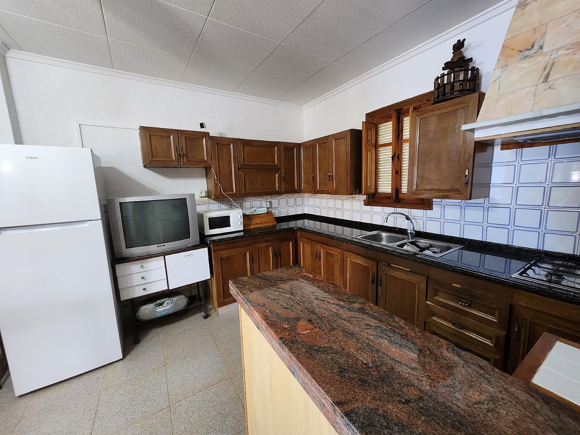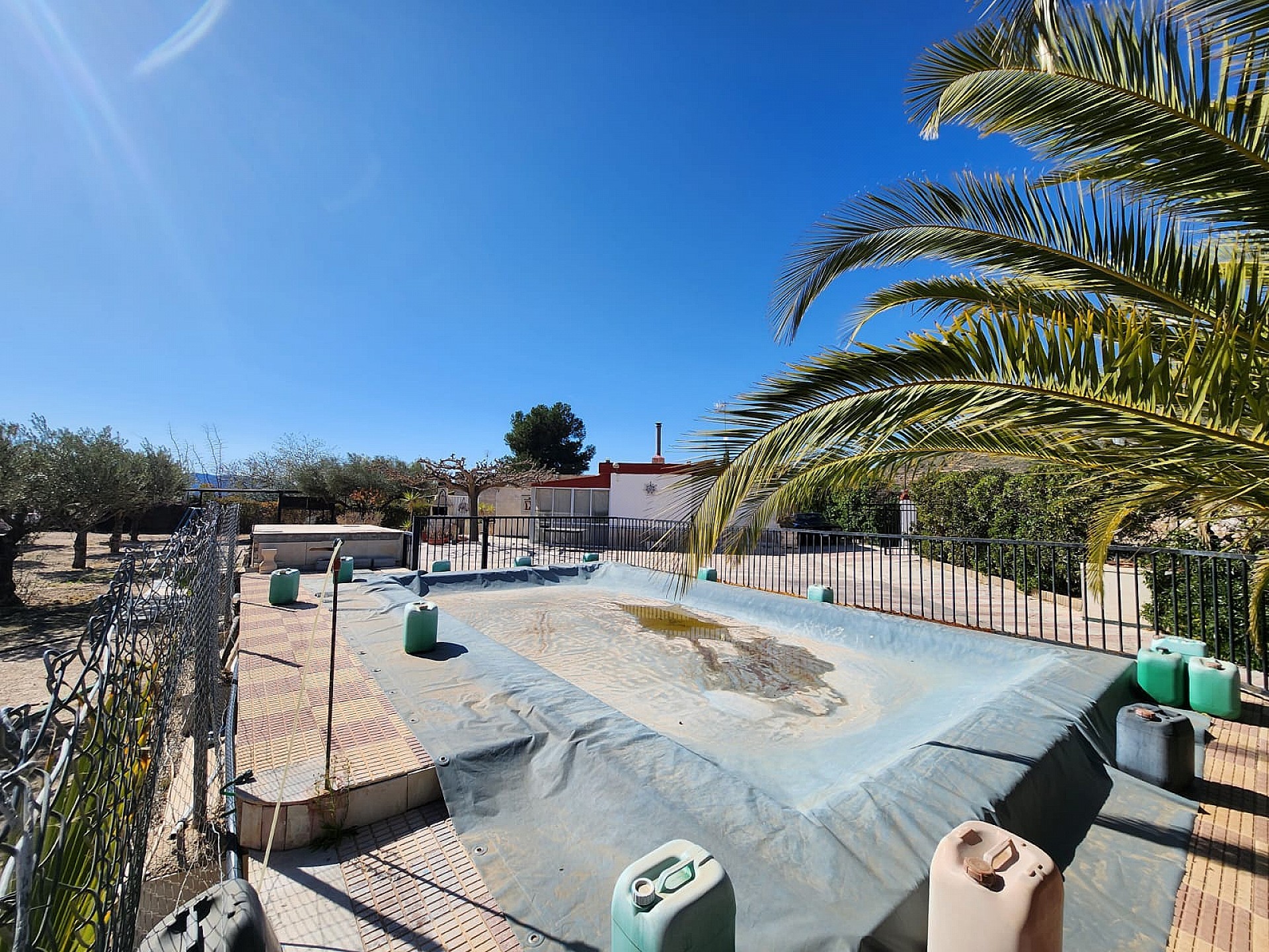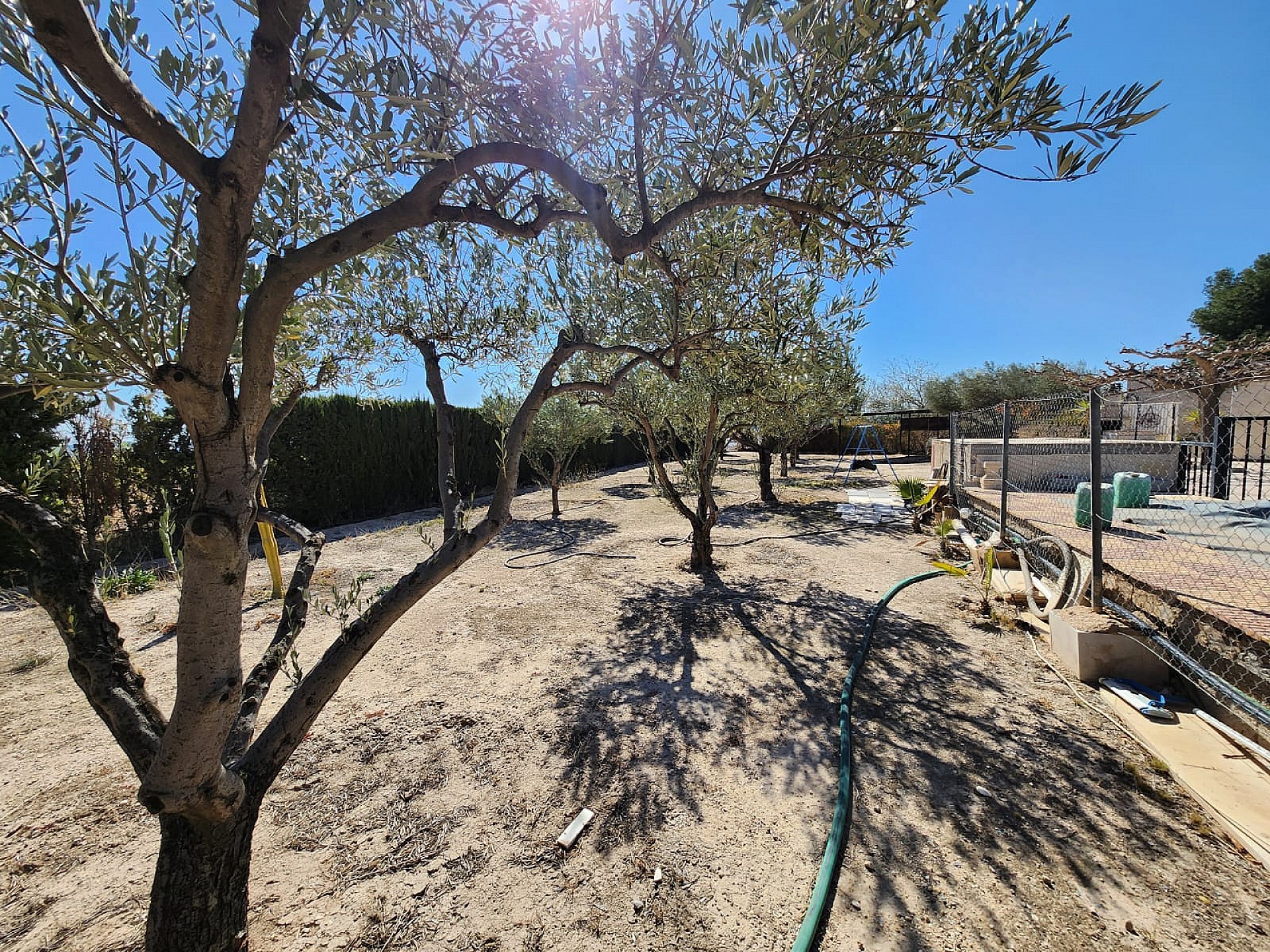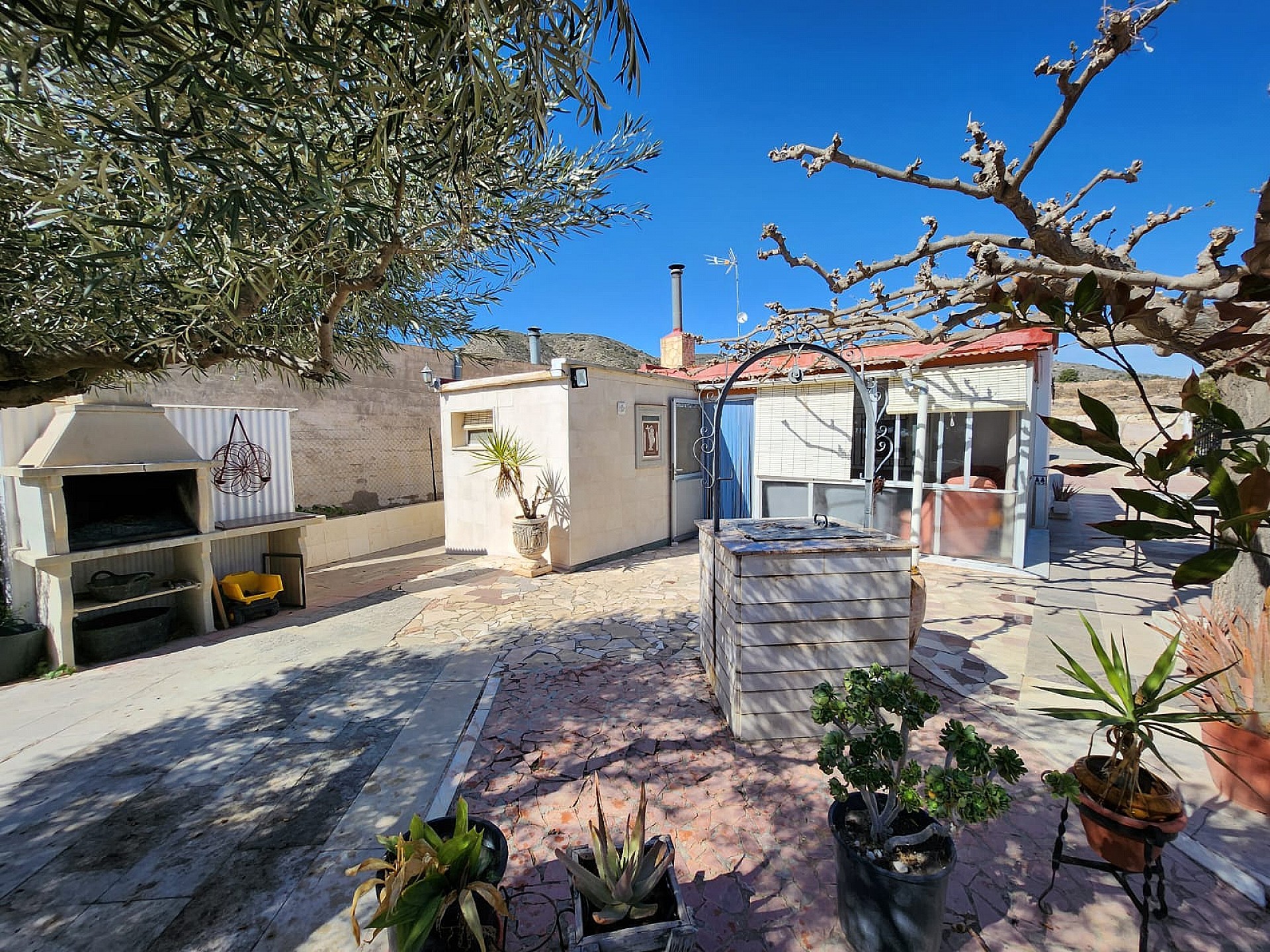 To the outside, there is around 1000m2 of land, which is fully fenced, and contains the pool area, a mix of trees, including around 12 olive trees, fig tree etc, as well as a car port, storage room, BBQ and an old generator room (now storage as well, as the house is now mains connected). The house is connected to mains riego water, and also has two large deposits (currently unused, but could be reconnected as a backup system, or to have drinking water delivered if you wished).