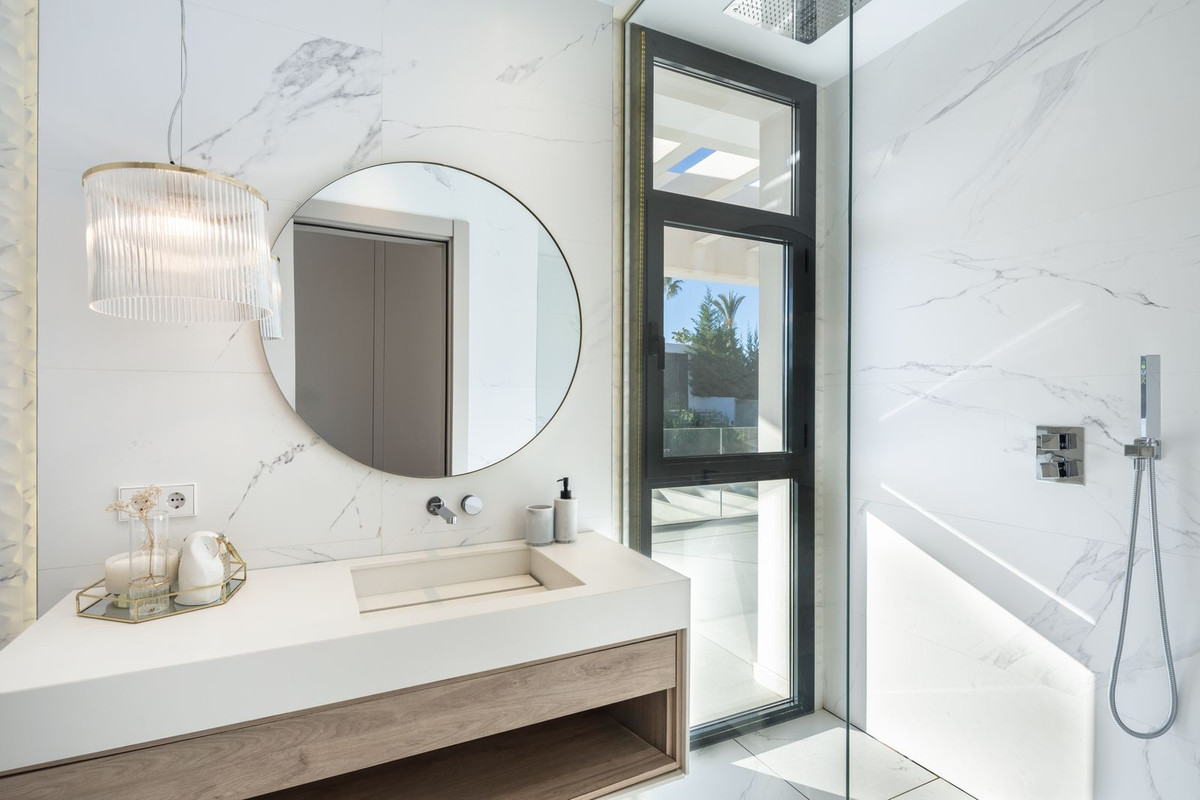 This exceptional modern property is located in the heart of Nueva Andalucía, steps away from the renowned Los Naranjos golf club and a short drive from Puerto Banús and Marbella Golden Mile. The residence spans across three levels, sitting on a generous 1,420m2 plot and boasts a stunning manicured garden.