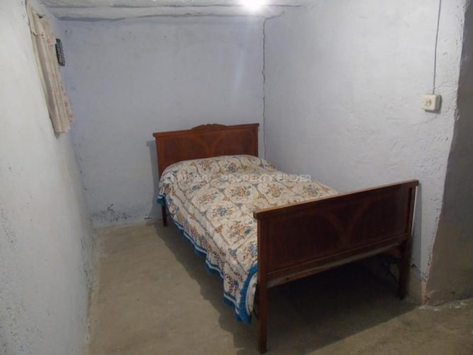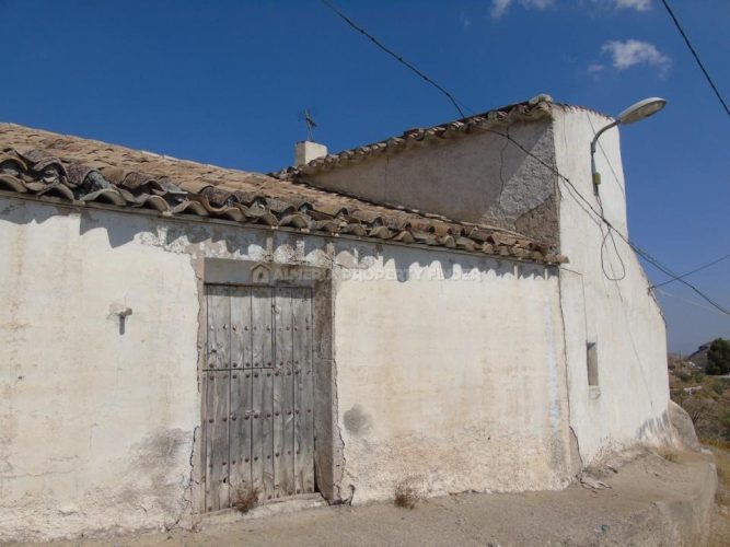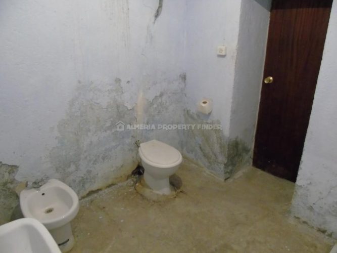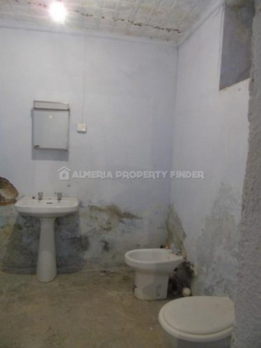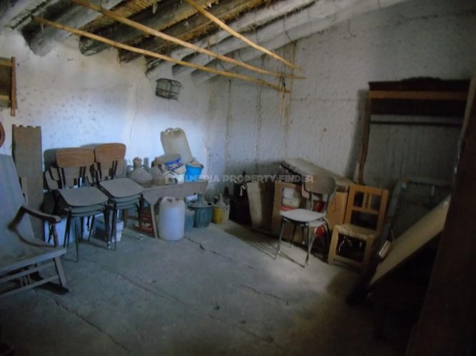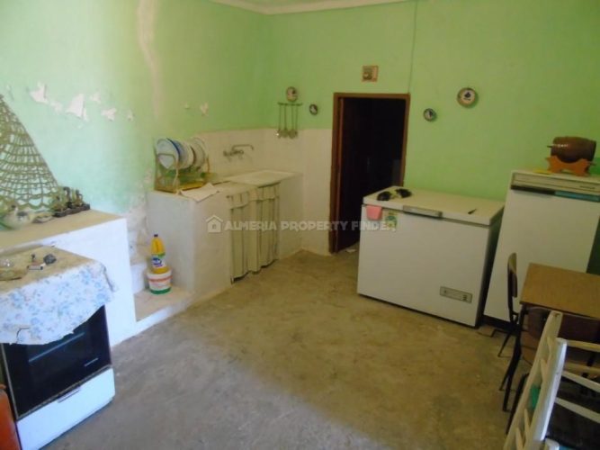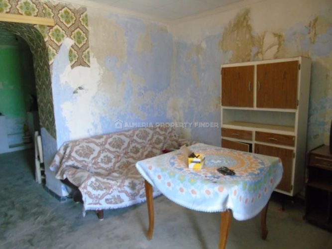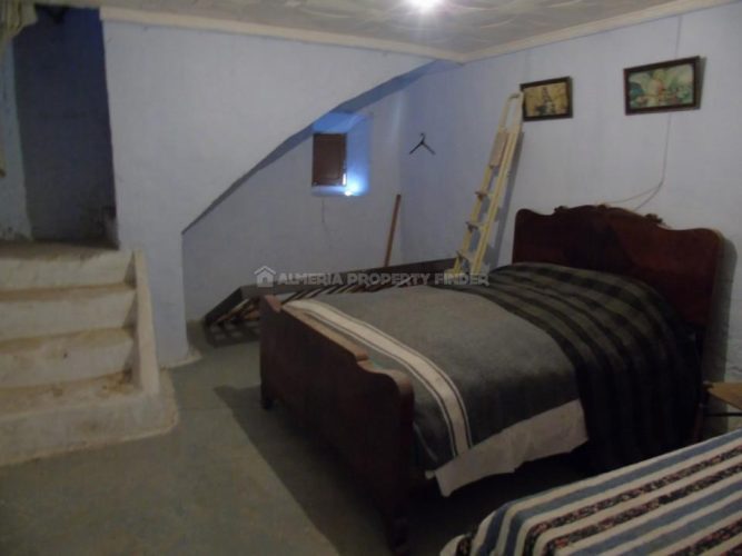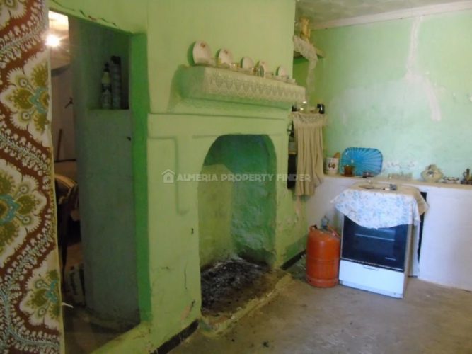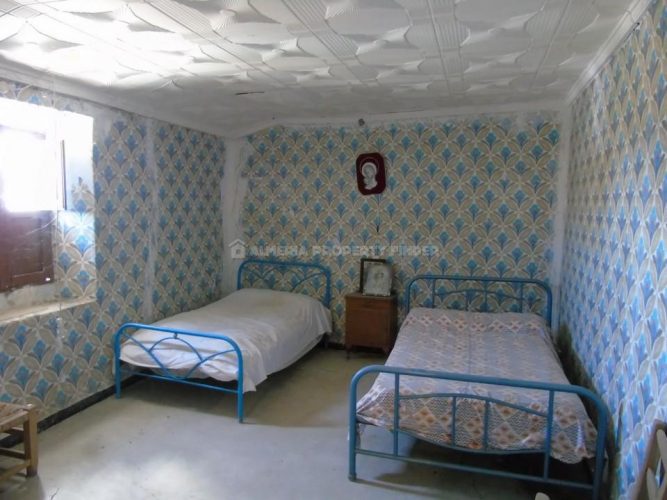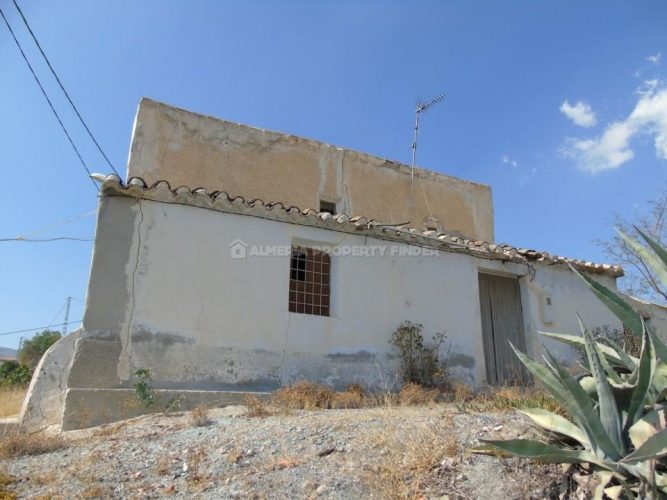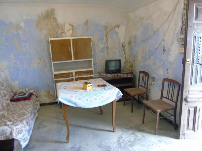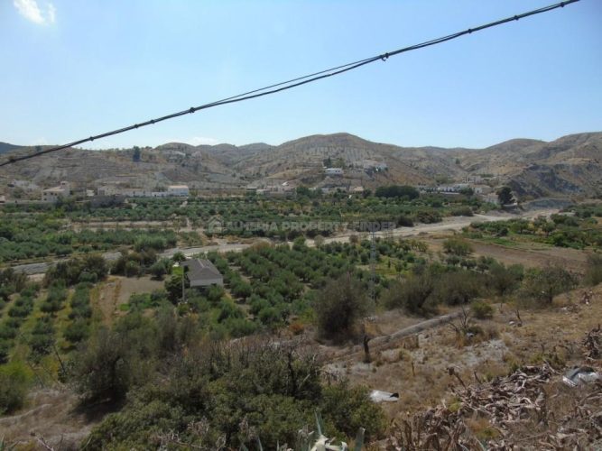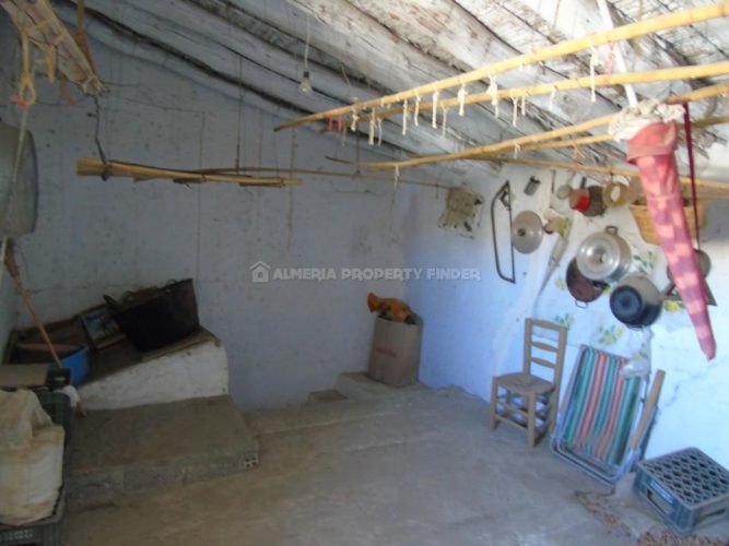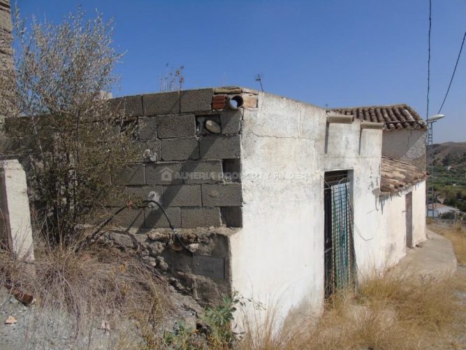 This 3 bedroom country house in need of renovation is situated at the top of a hill overlooking the Rambla de Oria. The house is in three distinct parts, the first being a large room with fireplace which in the past served the area as a local shop and bar. The counter is still in place. On top of the old shop is a same size roof terrace with commanding views, and to the side of the steps is a water storage tank.