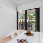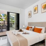 This beautiful ground-floor apartment is located in Amanecer IX. The apartment has 2 bedrooms, 2 bathrooms, and an open kitchen. It is a central apartment, which means it has a larger terrace area and access to the terrace from every bedroom and the living room. The terrace is a spacious 48 m², offering views of the garden and swimming pool.