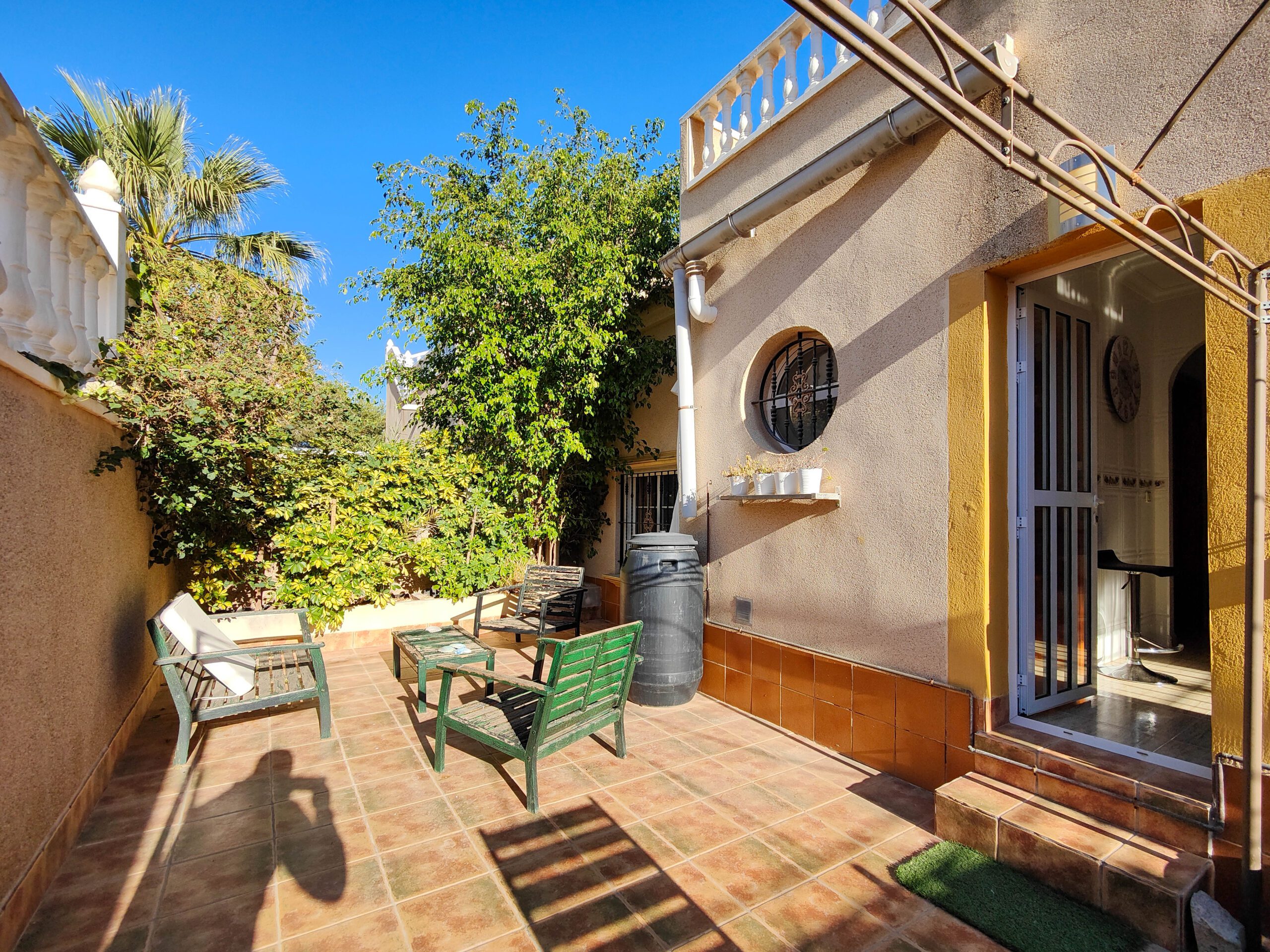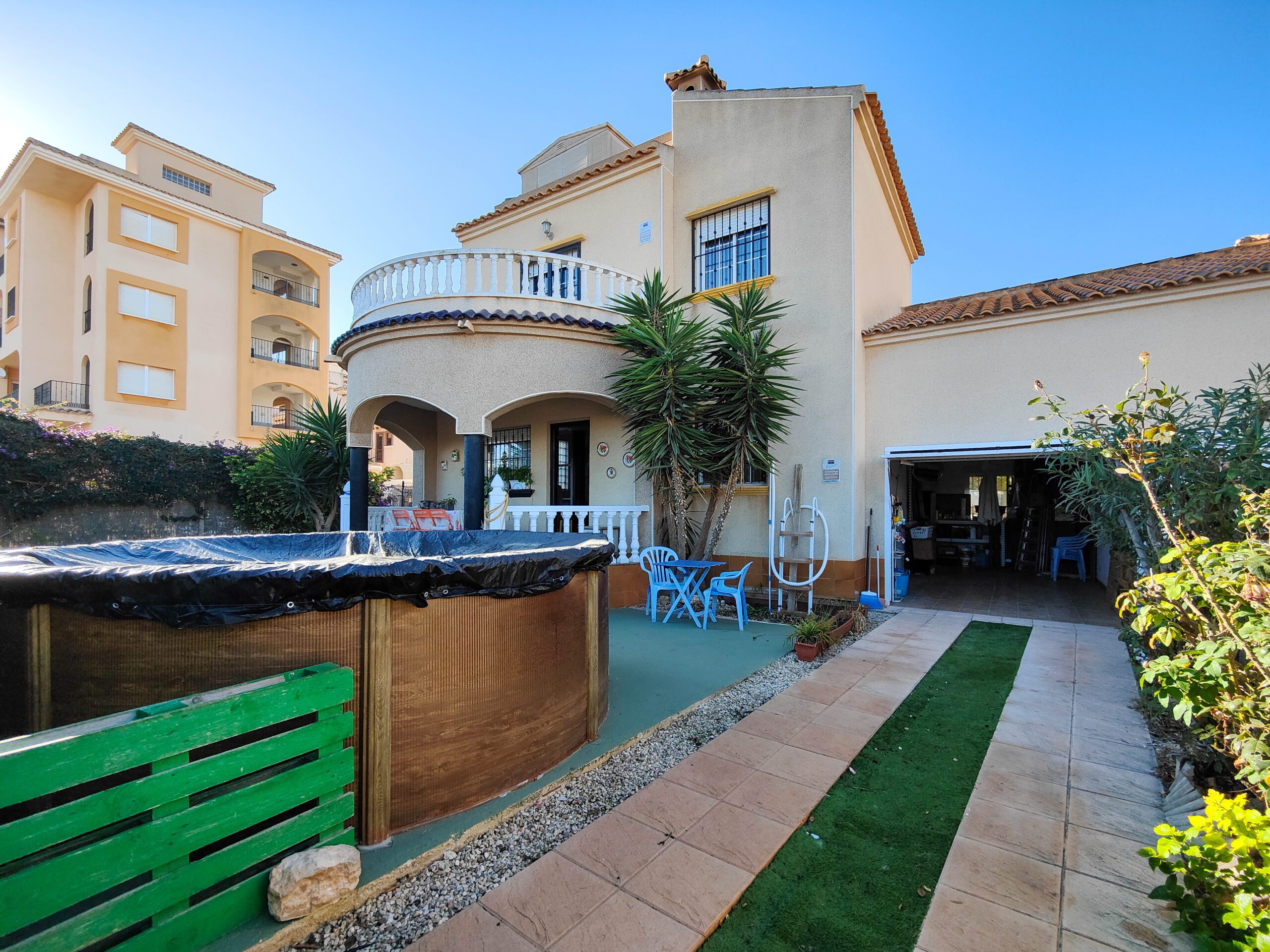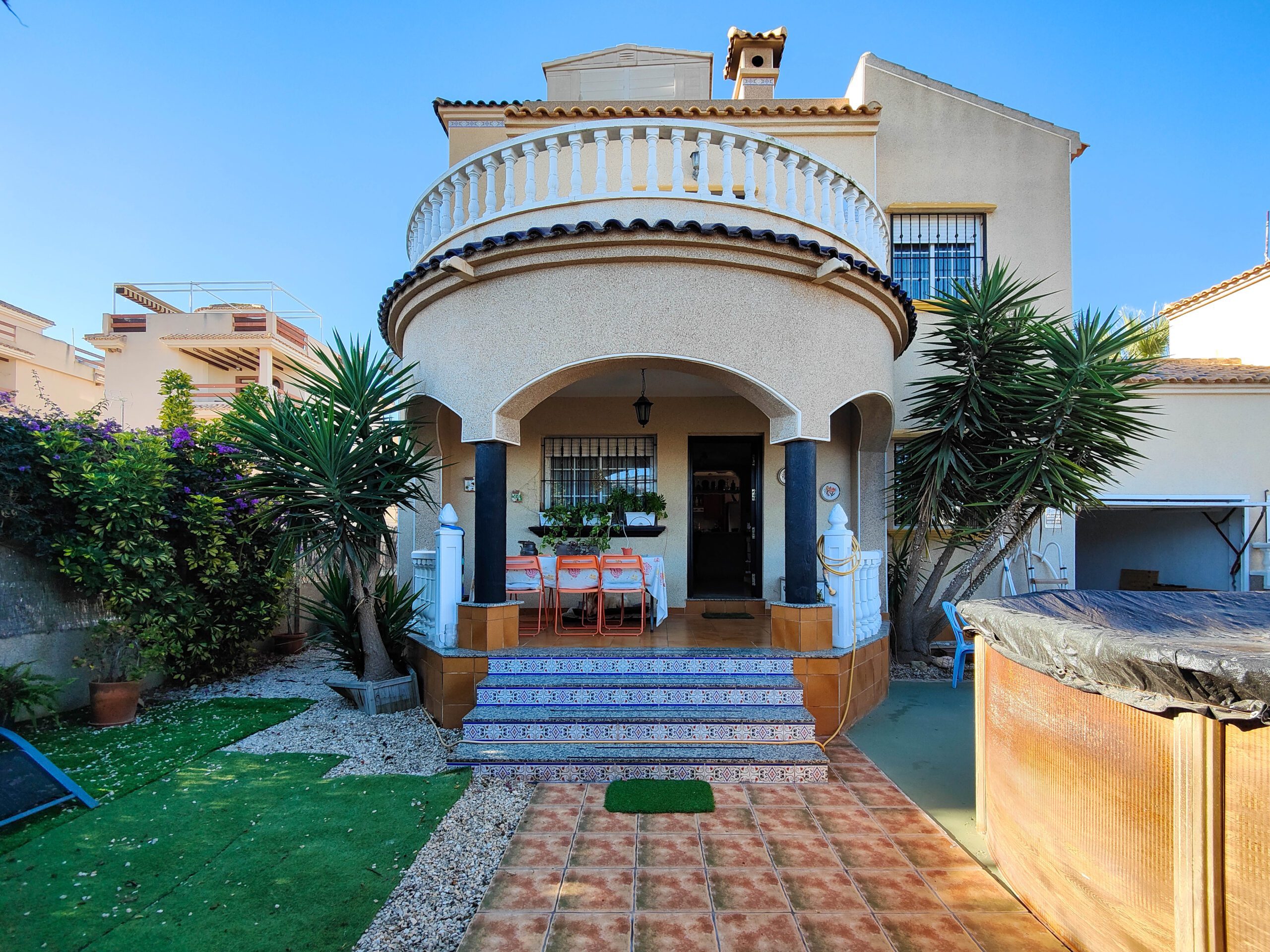 Detached mediterranean corner villa with a closed garage for sale in Villamartin - Orihuela Costa. This villa bellongs to a very small community without community fees. Just a short drive away from the Aldi supermarket, several shopping/comercial centers and the beaches of Orihuela Costa and Torrevieja.
