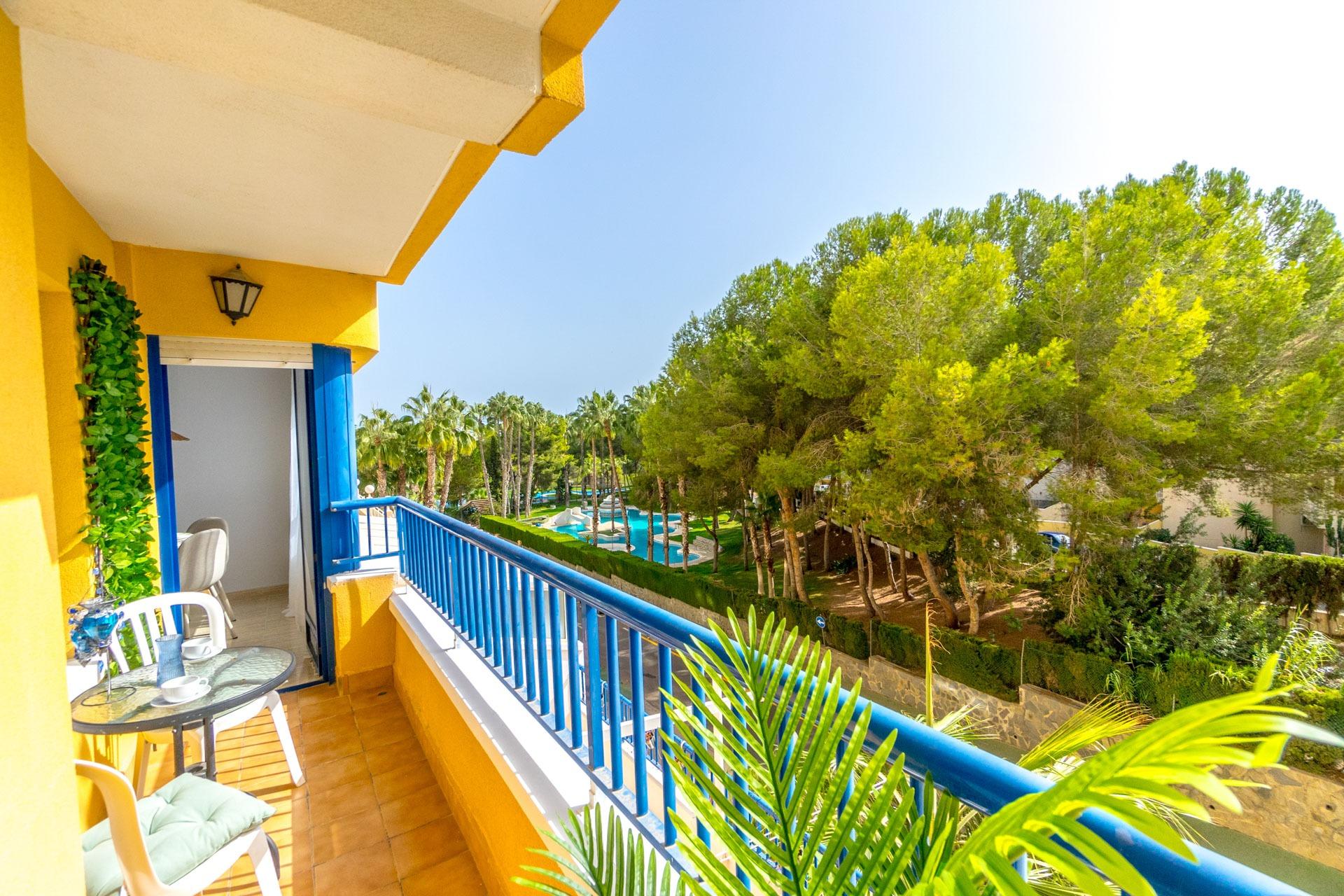 Nice first floor apartment in Residencial Altos de Campoamor with views of the pool and common areas. East facing. With 70m2, it consists of two bedro