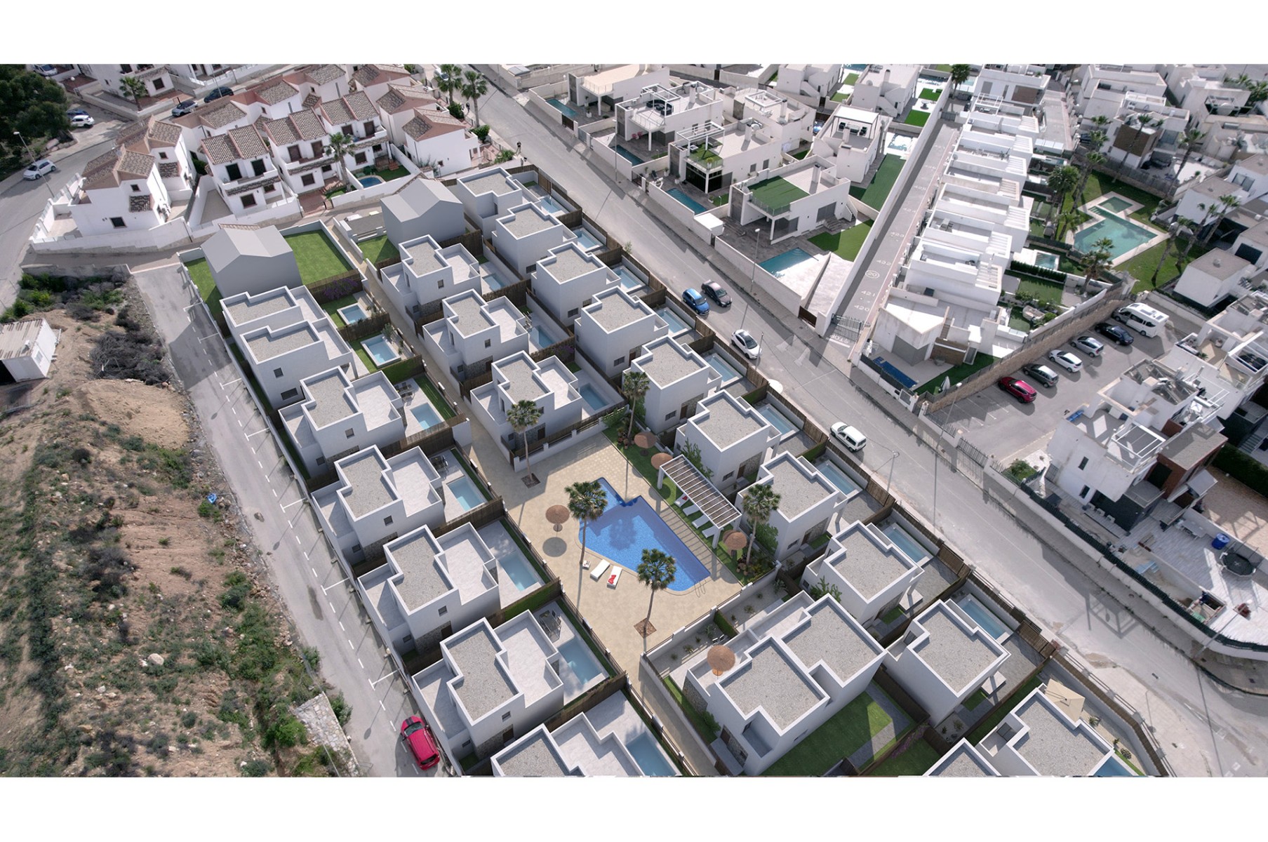 The project comprises detached villas on two floors, with 3 bedrooms and 2 bathrooms, with a choice of 1 or 2 bedrooms on the ground floor; and semi-detached villas on two floors, with 2 bedrooms and 2 bathrooms. All properties present a spacious and bright open plan lounge, dining area and kitchen, with direct access to a South-facing terrace and garden with private pool. Depending on the model, some properties include a parking space on the premises.