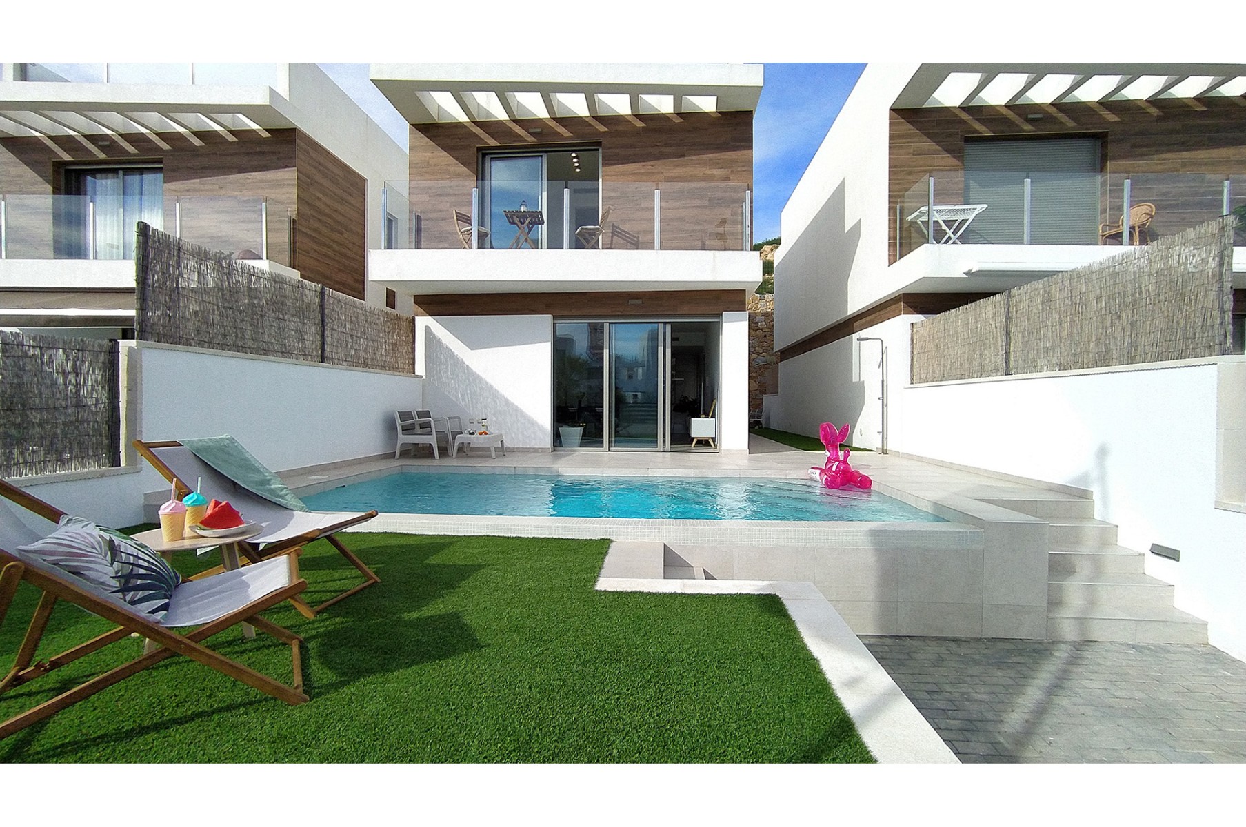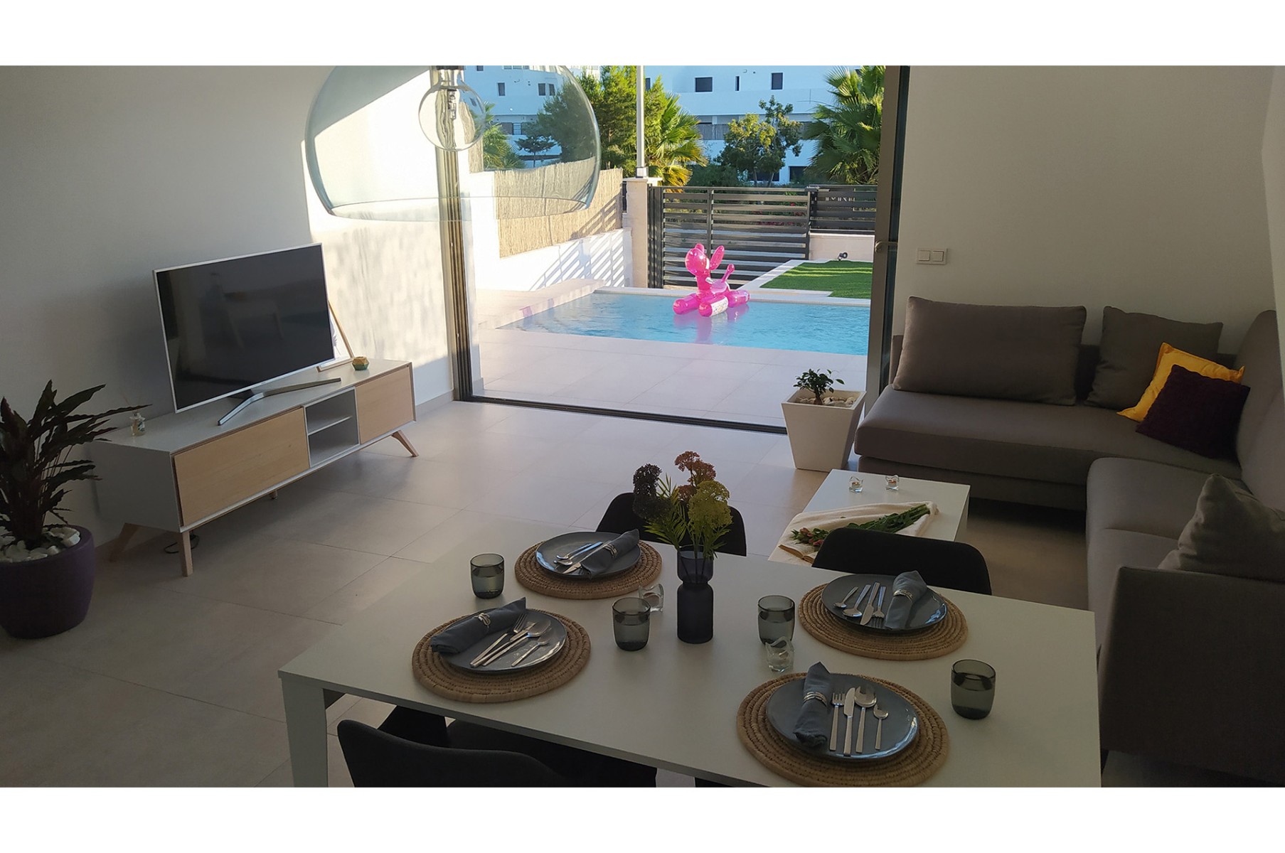 This villa of 120 m² is built on a plot of 300 m², with a swimming pool a solarium, 3 bedrooms, 3 bathrooms. The villa is on two floors. On the ground floor there is a large living area with living room, dining room and kitchen and a bedroom plus a bathroom. The upper floor has 2 bedrooms and 2 bathrooms both ensuite with a nice size wardrobe and access to the terrace. With a choice of high quality finishes this villa will have a real wow factor.
