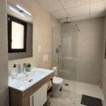 The open-plan living, dining, and kitchen area benefits from an abundance of natural light streaming in from both sides of the apartment. There is also a master bathroom, which features another walk-in shower.
