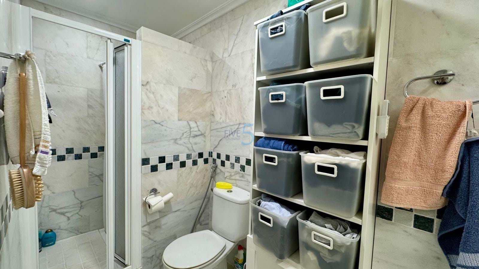 The two double bedrooms are thoughtfully designed with fitted wardrobes and their own air conditioning units, offering a cool and restful retreat even during the warmest months. The master bedroom is particularly spacious and includes a sleek en-suite bathroom with a modern walk-in shower and direct access to the enclosed balcony, making it a true sanctuary within the home. The second bedroom is served by a stylish family bathroom featuring a combined bath and shower.