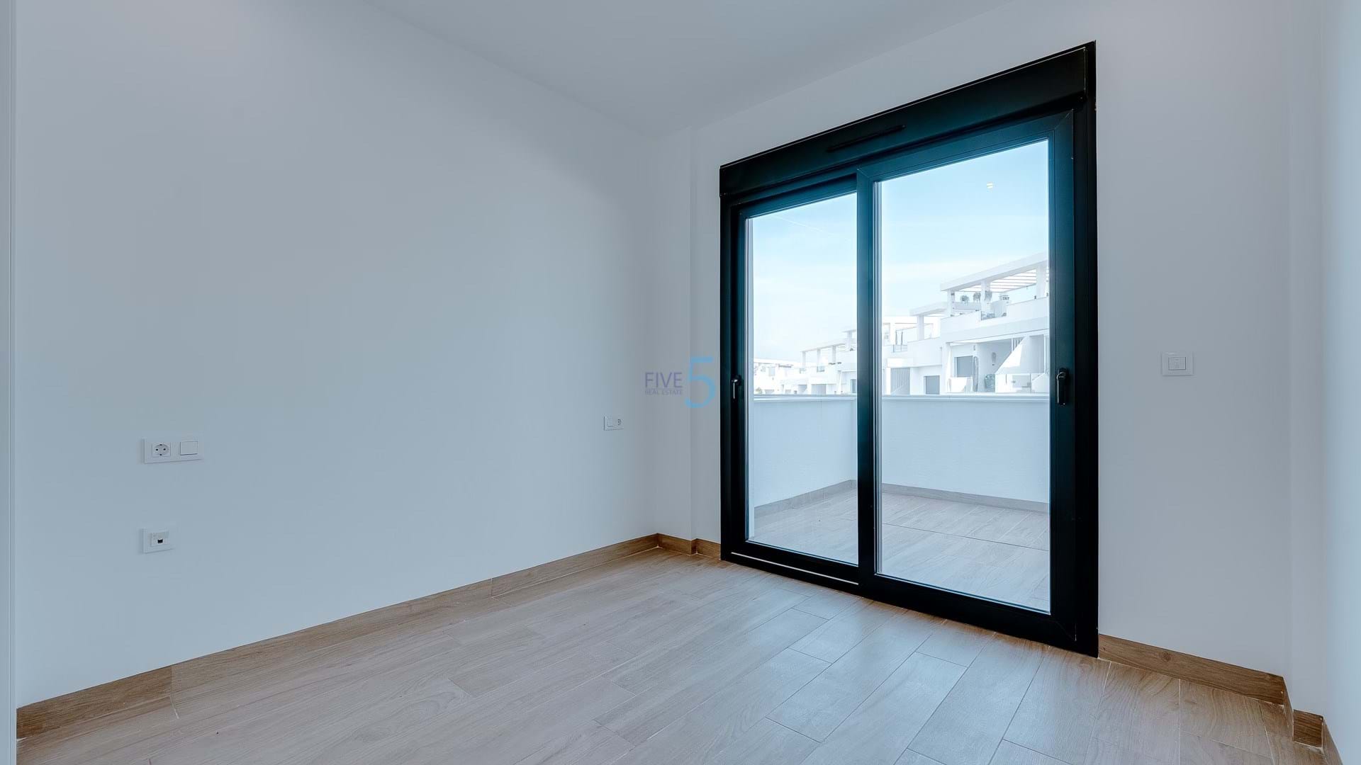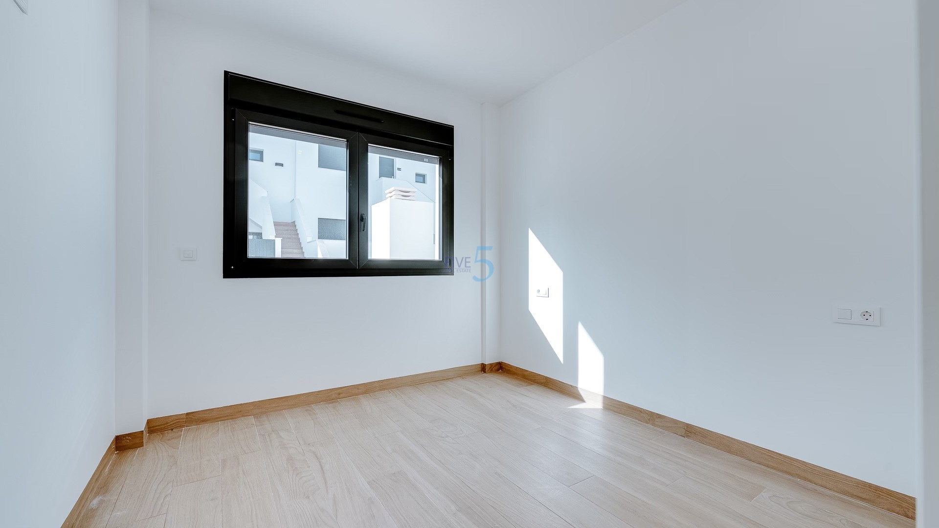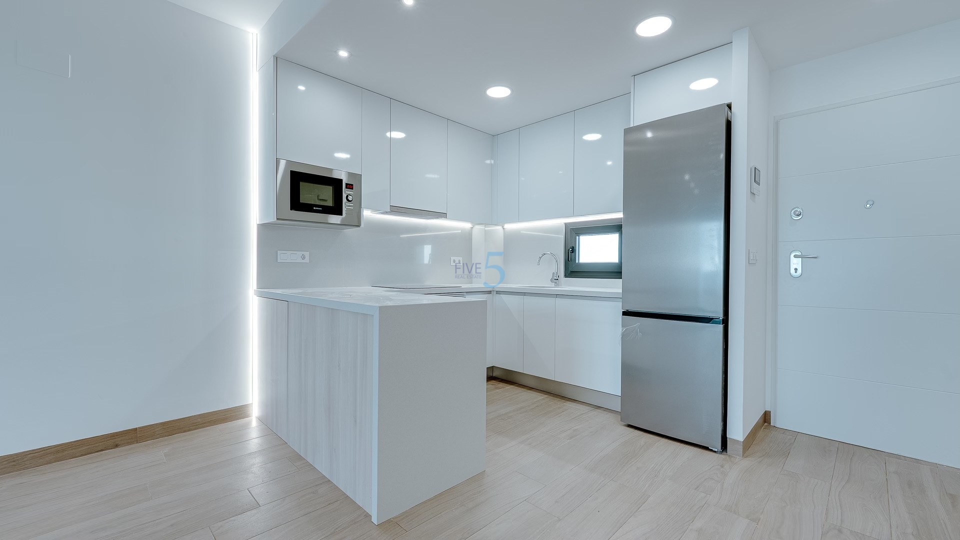 Inside, the apartment offers a sleek, contemporary design throughout. The modern open-plan kitchen flows seamlessly into the bright living and dining area, which leads directly to a private outdoor terracean ideal spot for relaxing in the Mediterranean sunshine. Both double bedrooms are fitted with built-in wardrobes, and the master bedroom includes its own en-suite bathroom with a walk-in shower as well as private terrace access. The stylish family bathroom also features a walk-in shower. The property is fully climate-controlled, ensuring maximum comfort throughout the year.