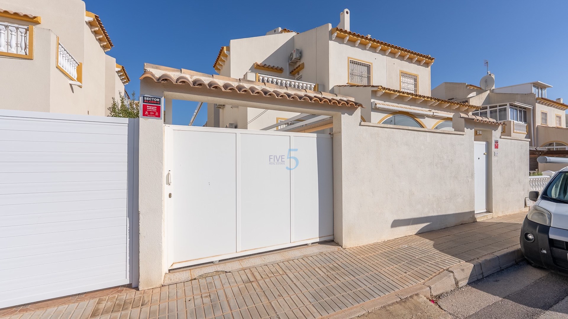 The property features a secure gated entrance with a private driveway and front terrace, perfect for enjoying the Mediterranean sunshine. A covered terrace area adds extra living space, ideal for cooler days or year-round relaxation.