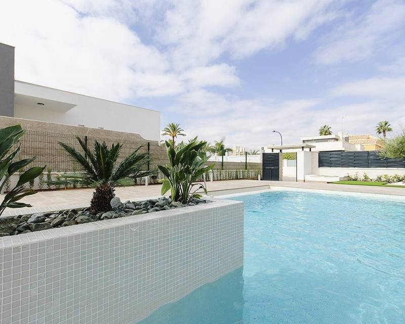 NEW BUILD VILLA IN ORIHUELA COSTA (CAMPOAMOR) Do you want to enjoy an exclusive vacation near the sea? Impossible not to fall for this ultra-modern villa in Orihuela Costa with 4 bedrooms, 2 bathrooms, private pool, garden and luxury extras, according to personal preferences. Its delicate infrastructure integrates with nature providing a quiet and isolated environment. Built with the highest quality materials, this elegant property is surrounded by abundant vegetation and a few meters from the cleanest beaches in Campoamor: Playa de la Glea, Aguamarina and Cabo Roig. It is a pleasure to have these three beautiful beaches that have been awarded with the Blue Flag within reach. Whenever you need a moment of reflection, you can go down to touch its crystal clear waters or lie down on its soft sand to read a book while listening to the placid sound of the sea. In the surroundings you will find all the essential services to live all year round: supermarkets, pharmacies, cafes, restaurants, shopping centers ... And if you are also enthusiastic about golf, less than 10 minutes away you can choose between three privileged golf courses of international recognition where put your aim to the test: Las Colinas Golf, Villamartín or Las Ramblas. The promotion includes several models of homes with 2,3,4 and up to 5 bedrooms. This particular villa consists of 4 double bedrooms, 2 bathrooms, a fully equipped American kitchen, an open living-dining room with great lighting, access to the garden and the beautiful pool. In addition, the price includes: Underfloor heating and mirror in bathrooms Indoor and outdoor lights Built-in wardrobes Security door Pre-installation of air conditioning Top brand appliances The house follows the trend of open concept design, enhancing spacious spaces and offering a greater sense of comfort and well-being in its interiors.