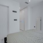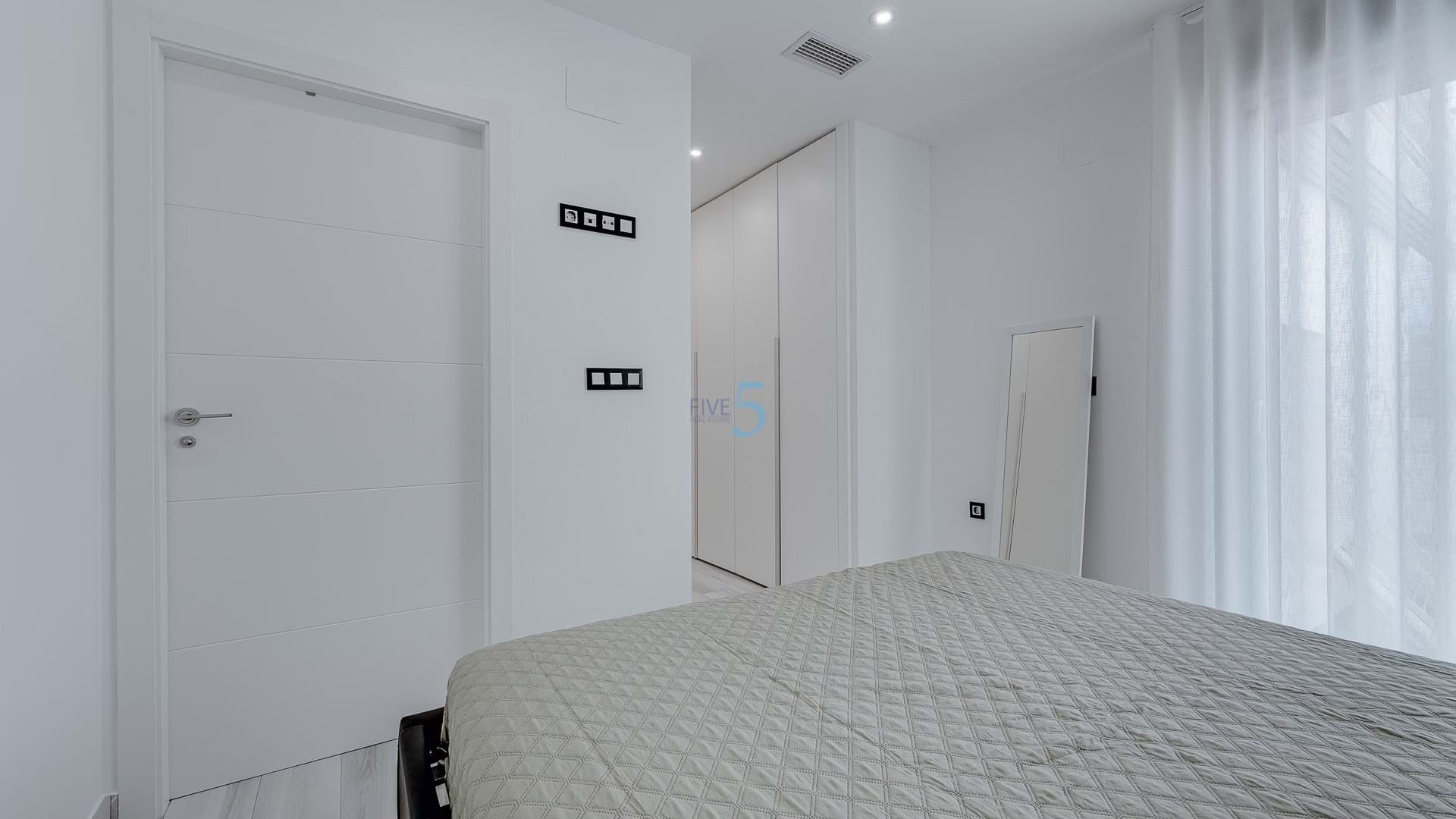 Inside, you'll find a bright and modern open-plan living, dining, and kitchen area with direct views of the pool. On the ground floor, there is a double bedroom with fitted wardrobes and an en-suite featuring a walk-in shower. A separate WC bathroom is also available for added convenience.