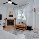 The ground floor also features a single bedroom with air conditioning, a ceiling fan, and a fitted wardrobe, as well as a contemporary bathroom with a walk-in shower.
