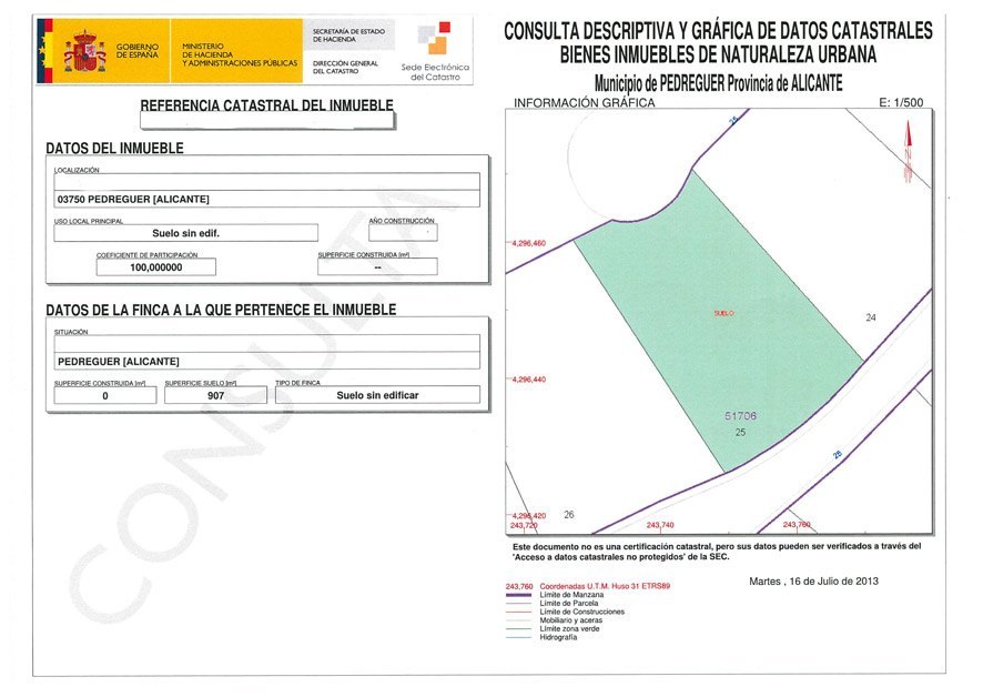 Nice plot for sale 907 m2 in a quiet urbanization in Pedreguer , Alicante , Costa Blanca. The plot has water services and electricity very close . N