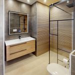Fully equipped bathrooms with vanity units, mirrors, and shower screens