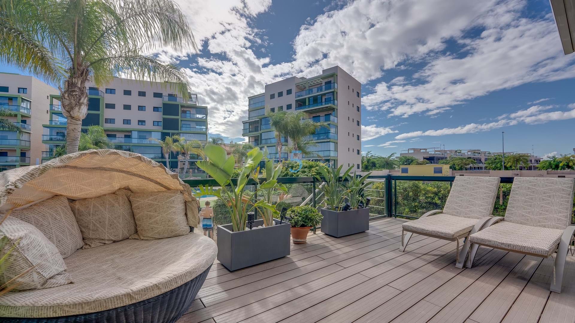 The living room area is spacious and very well presented as is the rest of the property and there are patio doors here with access to the south facing terrace. The owner has recently totally refurbished the fully fitted open plan kitchen with high end appliances and created more workspace and storage. The family shower room has also recently been refurbished and is sleek and modern. From the kitchen is a utility area and door leading to the rear terrace so there's plenty of outdoor space should you want sunshine or not. There are electric awnings to also provide shade when needed.