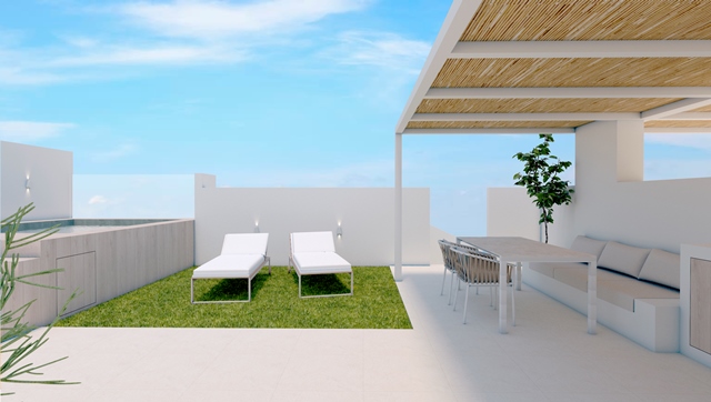 This projects exist of apartments, townhouses andeven 2 villas.  The penthouses have a living room with open fully fitted kitchen, 3 bedrooms, 2 bathrooms, a solarium with an outside kitchen and a private swimming pool.  There is indoor and outdoor lighting, ducted air conditioning machines linked to aerothermal energy.  Throughout the house there is a water underfloor heatyng powered by aerothermal energy.