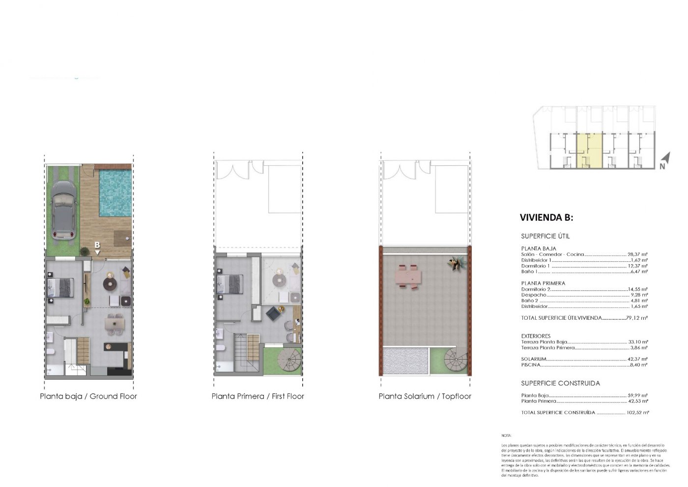 They have a double-height living room with open plan kitchen, 3 bedrooms, 2 bathrooms, private swimming pool, parking area within its plot, as well as a spacious solarium on the third floor.