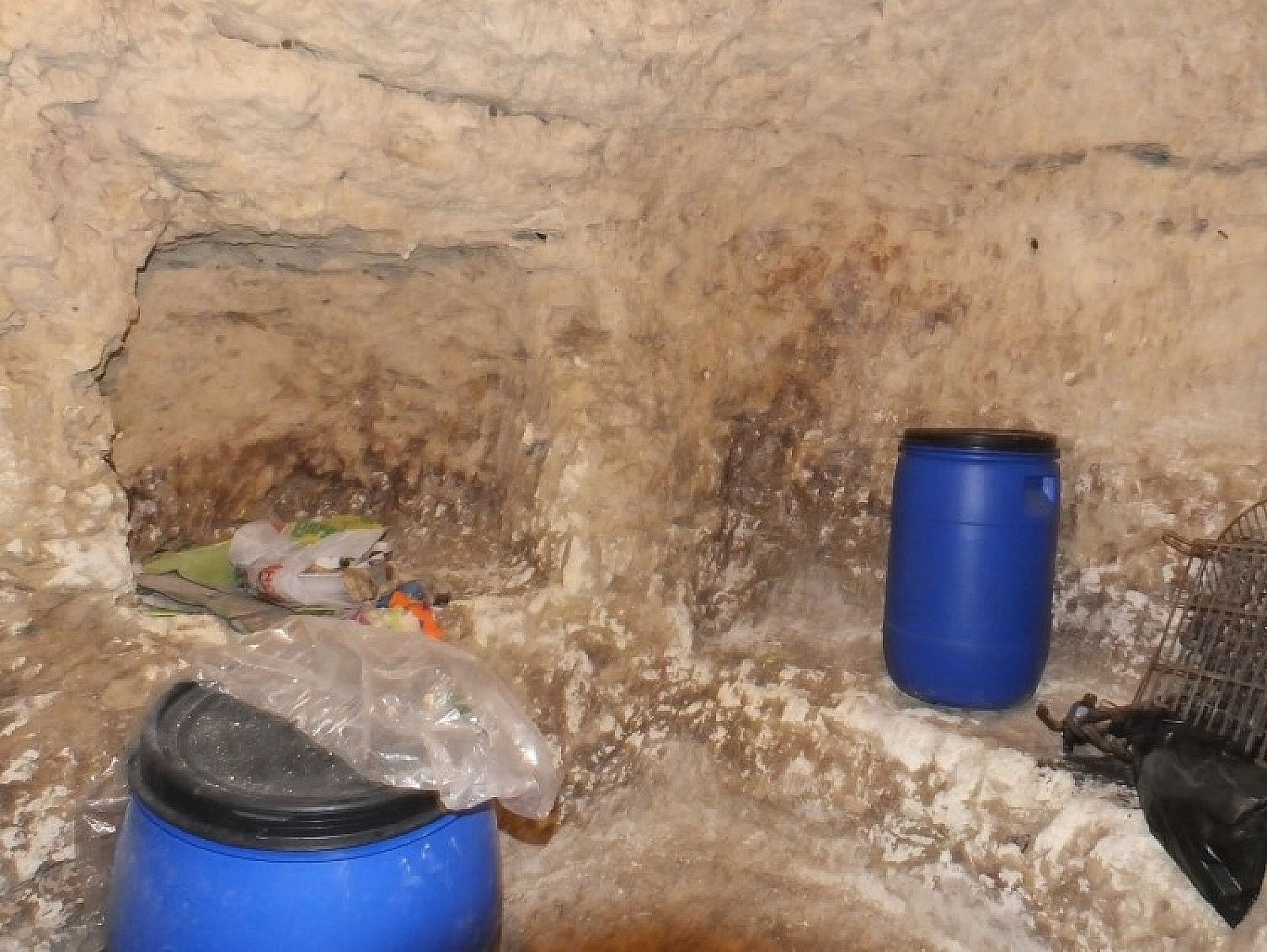 Further down the hallway is the living area with a large fireplace and two cave rooms, one used as a pantry and the other as a storage space.