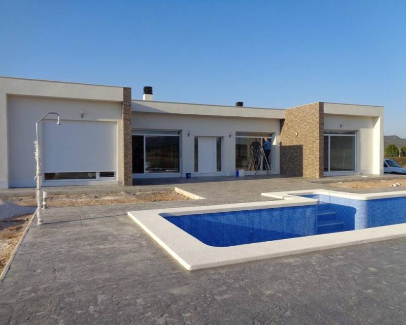 NEW BUILD VILLAS IN PINOSO You can choose Villas with traditional Spanish touches or super modern finishing, bright and clean. Different legal building plots available (rustic with minimum 10.000 m2), some walking distance to town, some totally private and our most popular ones are within 5-10 mins drive to a town. We have a plot for every taste, all with amazing views and all have mains water + electric included in the price and high speed internet available. From the biggest and best builder in the area and use top quality materials for a perfect finish. All houses include 2m stamped concrete terrace around the pool (colour and pattern to choose), 1m around the house, gated entrance, 3.000 m2 fencing, pre-installed ducted aircon, standard kitchen, security door, german tilt and turn windows (or sliding if prefered), built-in fireplace and chimney, pre-installation for tv and internet, gravel driveway plus a few meters around the house, septic tank. Bathrooms include a shower column, shower tray or bath, sink units (various colours to choose from) with sinks, taps and mirrors, plus a big selection of wall tiles. Wide selection of ceramic floor tiles, different colours, wood effect, etc. Kitchens include cabinets with standard doors and handles, as per plans provided, stainless steel sink and tap, pre-installation for oven, dishwasher, extractor. Various granite worktops to choose from included in the budget, other stone worktops available as extras. White goods not included. Marble staircase (cream, white, or grey) and railings included, plus railings for the front porch. Big fixed glass window on the staircase for extra light. Choice of tiles and steps design for swimming pool. Choice of the granite for the houses' exterior steps and window sils. You can customise the house to suit, most internal changes are free of charge, the houses can be extended and we can even build your own design. Upgrade to bigger pool, single or double garage, guest house, etc. at an extra cost. The beautiful and thriving town of Pinoso is approximately 45 minutes inland from Alicante and the white beaches of Costa Blanca and close to the Murcia, Alicante border It has a population of just under 8,000. Pinoso, also known as El Pinos is named after the pine trees that cover the areas mountain ranges. Pinoso provides a Spanish rural lifestyle, no traffic lights, hardly any traffic, practically the only jams are caused by the tractors taking the grapes to the Bodega. The fields are planted with vines, almonds and olives. In February the fields are filled with pink almond blossom. Pinoso has many bars, restaurants and shops, a new 24 hour medical centre, dentists, two primary schools and 1 secondary school, a theatre. There's an excellent Sports Centre with outdoor swimming pools, tennis courts, football pitches and gymnasium, library and many other facilities including a beautiful picnic area among the pines, complete with barbecues, seating areas and running water.