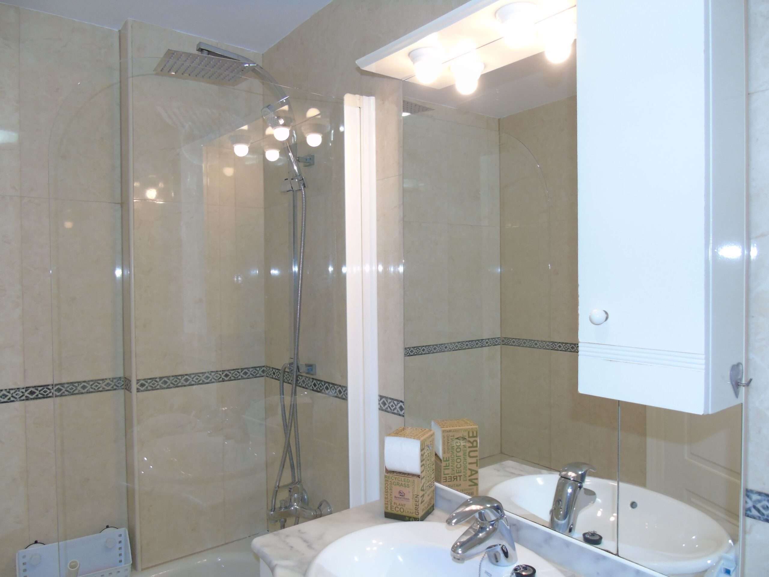 En-suite 3m2. Bath with a shower over and a fitted shower screen.. Vanity unit with inset hand basin, fitted mirror with lighting and a WC.