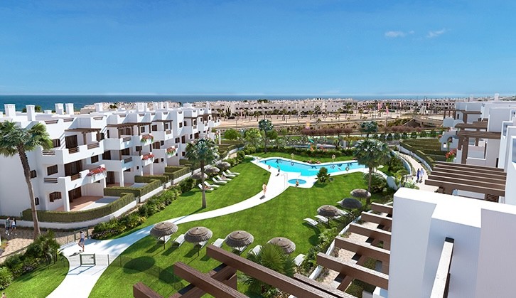 This project offers beach apartments 1, 2 and 3 bedrooms and large terraces. The ground floor properties have a covered terrace and garden. The owners of the first floor properties will enjoy the Almeria sun on their spacious terraces. And those interested in the penthouse will also have a large outdoor space in the form of an top floor terraces come with shower, electricity and TV connection where it is possible to have a barbecue. All the property types have a parking space in the basement and future residents can also purchase a storage room.