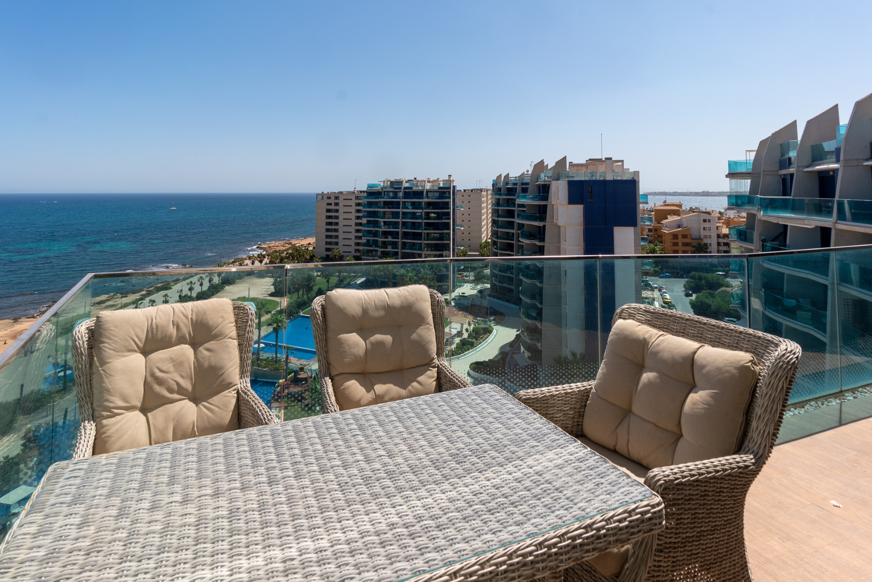 Frontline Penthouse in the Prestigious Sea Senses Complex, Punta Prima. This modern 9th-floor penthouse, built in 2015, offers 68.