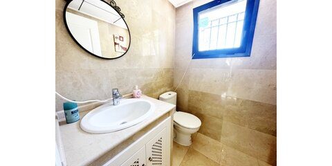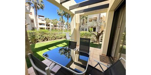 Murcia Golf Properties are excited to offer this two bedroom two bathroom semi detached villa for sale on the wonderful Roda Golf and Beach Resort. The property is in a great location next to one of the resorts communal swimming pools which serves just a handful of properties. The lawned gardens are a sun trap, having all day sun with a sheltered patio and bbq area to the rear. The property has it's own driveway where you are able to charge electric vehicles. The resort itself is located near Los Alcazares which is situated by the Mar Menor sea. It's a great property for families or golfers with plenty of bars, shops and restaurants near by. Roda has an on-site restaurant and gym but is a short walk from the village of Roda with a supermarket and several bars and restaurants. Murcia airport is approximately 20 minutes drive and an hour to Alicante airport. The villa has marble floors throughout and marble tiling in both bathrooms. There is ducted air-con throughout which can be controlled separately for the ground and first floors. You enter the property into the hallway with a downstairs cloakroom. The modern galley style kitchen has all mod-cons and a utility room. Patio doors lead from the lounge to the tiled terrace and lawned gardens and pool. Marble stairs lead to the first floor with two double bedrooms, both with fitted wardrobes. The master bedroom has access to it's own private terrace where you can enjoy views over the golf course. There is also a separate family bathroom. The property has a large storeroom in the garage of a nearby apartment block. This is a fantastic property. Contact MGP to book a viewing appointment with one of our agents.