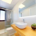 Vitrified porcelain bathroom fixtures of modern design with matching taps. In the bathrooms the vanity sink furniture will be suspended on the wall. Finished shower area with glass partition.