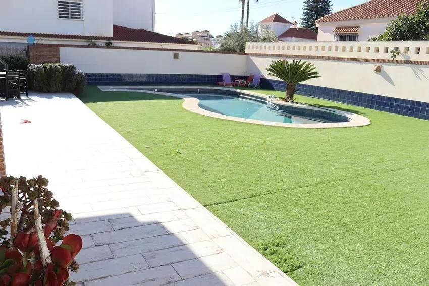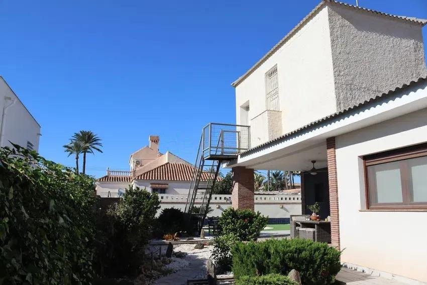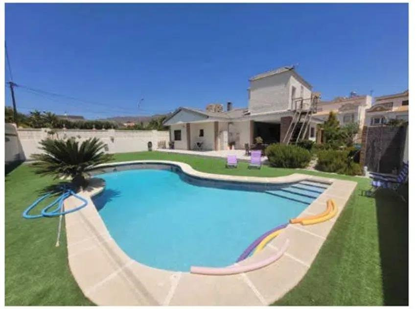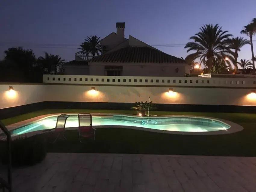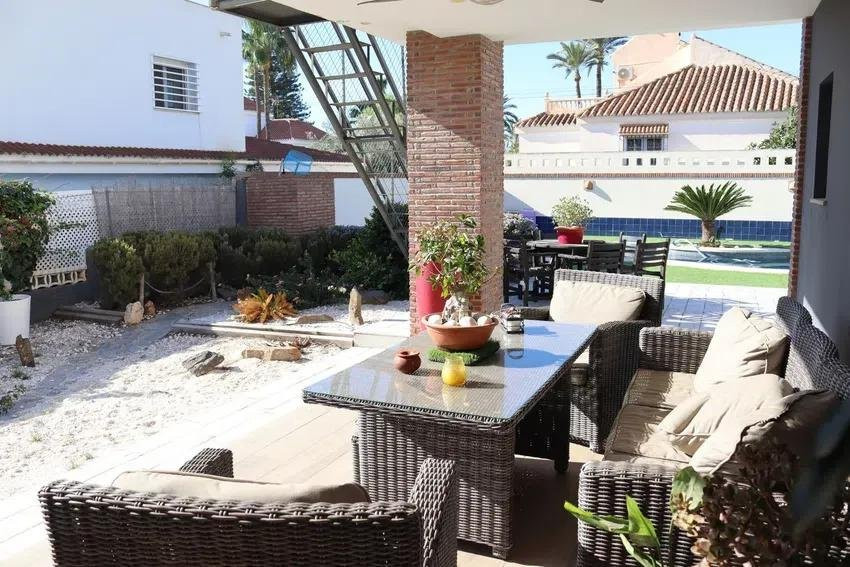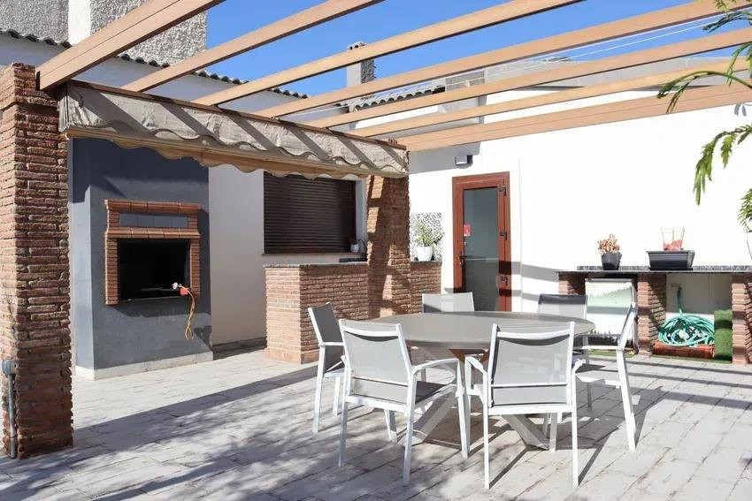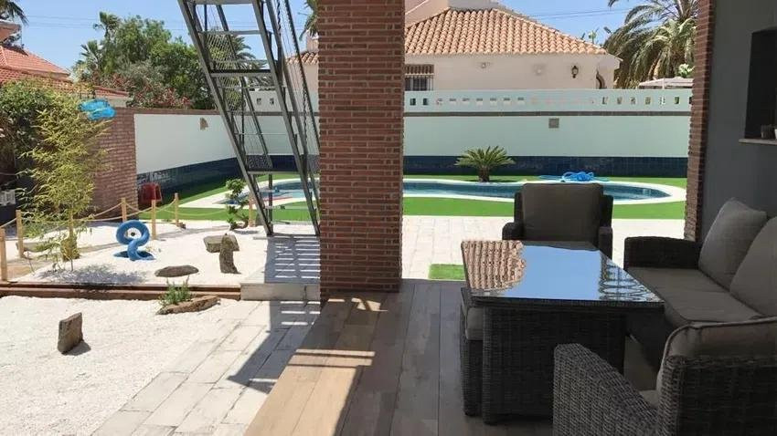 Available this stunning villa completely renovated in 2017, located in a quiet residential area of La Hacienda near services and schools. Built on a large plot of 720 m2, this home offers everything you need to enjoy family life. The ground floor has 3 rooms, including a master bedroom with en suite bathroom. In addition, there is 1 additional bathroom to serve the other two bedrooms, all with fitted or custom wardrobes. Spacious and bright living room, with large windows overlooking the roofed outdoor terrace and pool, creating a cozy and relaxing atmosphere. Nice fully equipped kitchen with direct access to the back terrace with perfect pergola to enjoy outdoor meals. Dining room in kitchen area. Both rooms may be joined or not by a wooden door dividing several rooms if you wish. High floor: It consists of 1 bedrooms or additional space for your needs, has separate access from the garden area. Basement: Space to enjoy fireplace and warm atmosphere. The house is equipped with air conditioning in all rooms of the house on the ground floor. In addition, it has smooth walls, ceramic floors in natural wood of Porcelanosa. All materials are of first quality. Enjoy a beautiful swimming pool, well-kept gardens, an atmosphere that invites the pool debugger to rest without interference is underground to avoid discomfort and visual cleansing. The terrace is prepared for the installation of a toilet. The plot consists of an access to the parking lot to leave the vehicle inside the plot. You can't miss the opportunity to enjoy this amazing villa!
