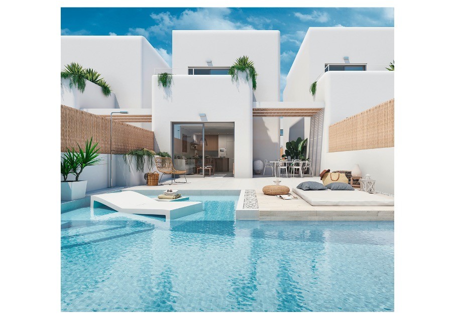 LAST ONE AVAILABLE - FULLY FURNISHED, WHITE GOODS AND AIRCO INCLUDED - New residential complex villas with 3 bedrooms and 2 bathrooms in San Fulgencio, La Marina. The entire project consist of 23 Ibiza style villas, all built on independent plots between 180m2 and 289m2 with terrace, parking space and private pool.