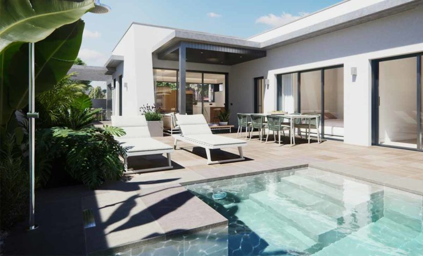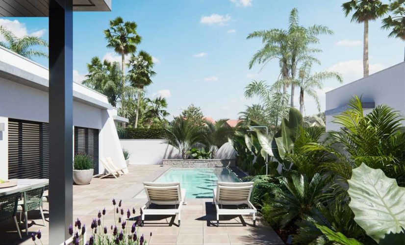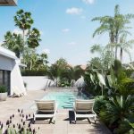 The modern and elegant kitchen in open concept paired with the dining room are surrounded by large windows that provide daylight throughout the day, and direct access to the pool and the private gardens, that are completely finished. The villa is fully customizable; including high-end appliances embedded in design and completely finished bathrooms with suspended appliances, countertop sinks and thermostat taps.