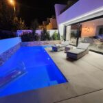 Located just a 15 min walk from the beach this villa is on a quiet street but close to amenities. Electric gates lead to a large garage space (21m2) to allow off street parking. The property can be opened via an app using a smart lock system or it has a finger print sensor. Through the front doors leads into a stunning modern fully equipped kitchen with top quality appliances. Off the kitchen is a utility room with washing machine and dryer. The kitchen is open plan to a spacious living room with large glass doors and views to the private pool. The pool is heated and has modern remote control lighting. It has a custom made jacuzzi with 48 jets operated by 3 high efficiency specialised pumps. There is a pool shower and an outdoor sound system.