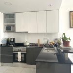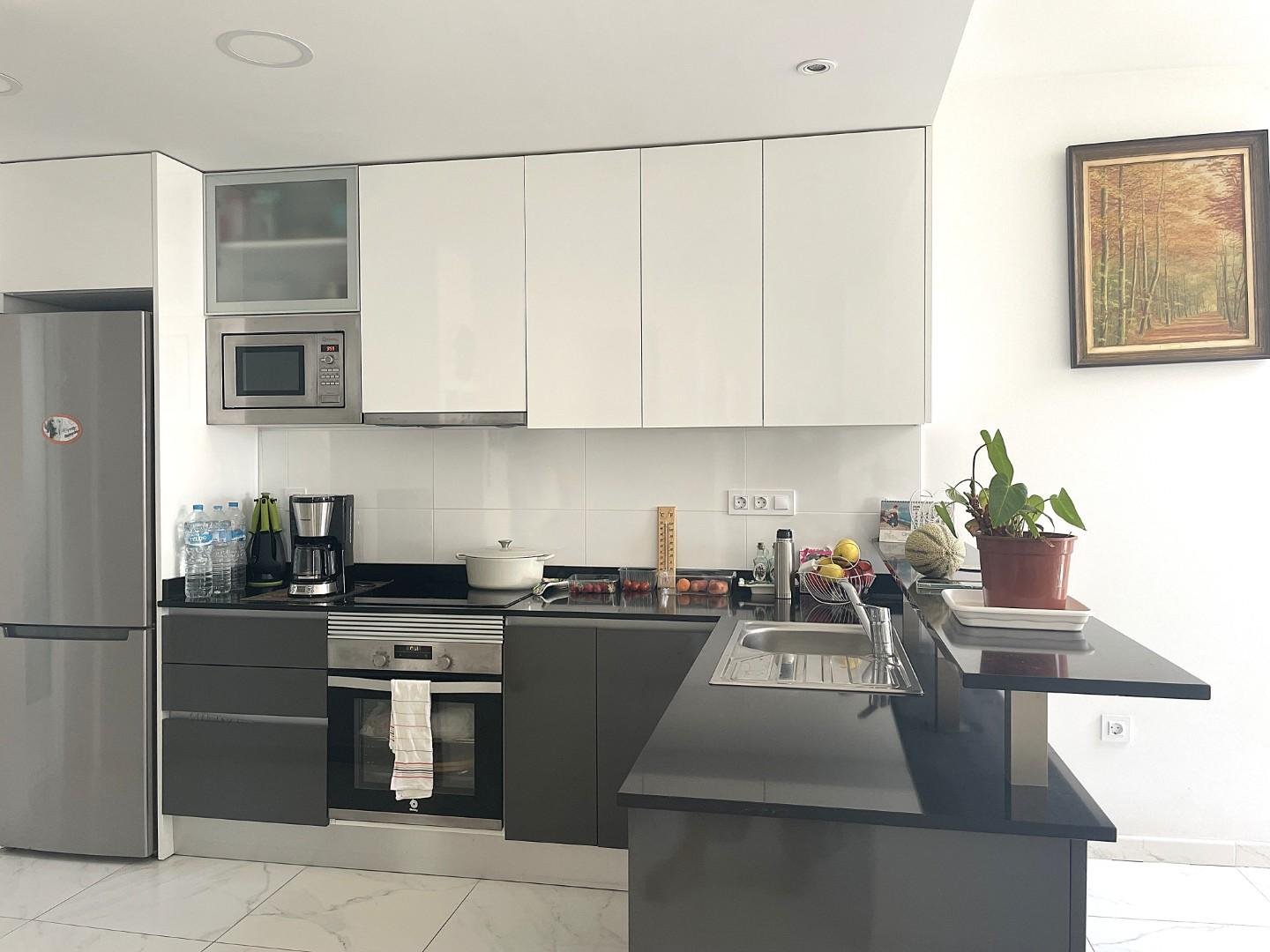 The spacious, light-filled lounge and dining area opens through sliding doors to a private terrace with serene views over the landscaped gardens and one of the complex’s communal pools. An open-plan kitchen is fully equipped with premium appliances, including a large fridge-freezer, oven, hob, microwave, and dishwasher. A separate utility area houses a washing machine and dryer for added convenience.