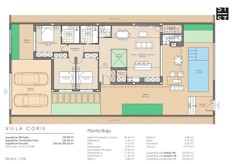 Villa Coris offers private parking for two cars, a rooftop solarium spanning 48m², and landscaped garden areas perfect for entertaining or relaxing plus a private pool. Additional features include pre-installed air conditioning and a range of upgrades such as solar panels or a basement. Set in a community with easy access to beaches, golf courses, and local attractions like the Aguilón Golf Club, this development is an ideal choice for year-round living or as a holiday home.