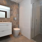 Fully equipped bathrooms with furniture, mirrors, and shower screens