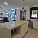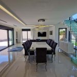 Inside, this villa continues to impress. The open-concept living, dining, and kitchen space is framed by floor-to-ceiling glass doors, allowing light to flood in and showcasing the panoramic views from every angle. The high-spec kitchen is a sleek space with the latest smart appliances, including an oven, dishwasher, and an adjacent laundry room. The centrepiece is the elegant floating glass staircase, a striking design feature. On the ground floor, a guest WC, and a spacious double bedroom with walk-in wardrobe and luxury en-suite open directly onto the poolside terrace for that seamless indoor-outdoor living.