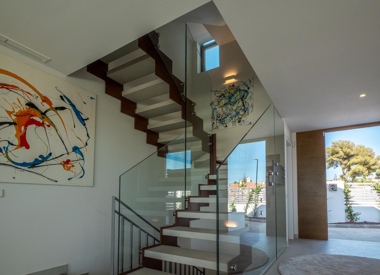 Set on a 289 m² plot, the villa features an expansive 55 m² open-plan living area with a designer kitchen equipped with NEFF appliances. High-quality finishes include underfloor heating, large porcelain floors, Cortizo exterior carpentry, Geberit toilets, Ritmonio taps, and basic home automation.
