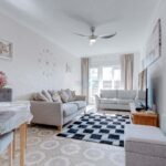 The spacious living room comprises a dining area and an L-shaped terrace where you can spend time outdoors to eat or simply relax. The modern kitchen is fully fitted. From the kitchen the rear utility balcony can be accessed where there is a sink, modern water boiler and plumbing for a washing machine.