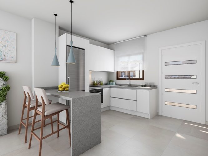 These Bungalows located in San Pedro del Pinatar (Lo Pagan) are delivered with 2 bedrooms, 2 bathrooms, terrace of 10.56m2 and a solarium of 52m2 with beautiful views of salt lakes and the Mar Menor which is located approximately 1km from this project , so you only have to walk 14 minutes to get to the beach (Playa de villa Nanitos). These Bungalows will be delivered with a beautifully finished kitchen with kitchen appliances included, the house will be equipped with electric shutters and there is already a pre-installation for air conditioning and also a pre-installation for the charging point of an electric car. This residence is characterized by a beautifully maintained communal area with garden and two large communal swimming pools to optimally enjoy the Spanish weather. You can find these bungalows on our website ( WWW.GLOBAL-SPAIN.COM ) under the following reference: GS1323