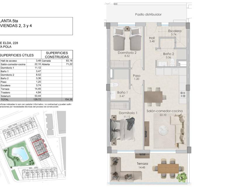 The residential has 3 and 2 bedrooms apartments, both types include 2 full bathrooms, open plan kitchen with living room, fitted wardrobes, terrace, parking space.