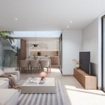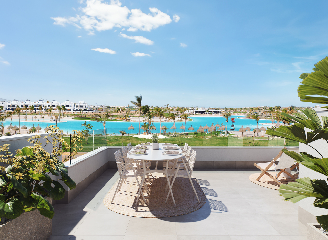 These luxury villas are located second line from the lake. They include 3 bedrooms, 2 and a half bathrooms, open living dining area, fully fitted kitchen, a basement of 103m2, private swimming pool and solarium with beautiful views.Santa Rosalia Lake and Life Resort is by no doubt the most exciting new project on the Costa Calida offering what has not yet been seen in this part of Spain. With a great infrastructure in place, children´s play areas and the impressive and attractive lake, this is one of the most popular places to purchase in the region of Murcia at the current time. The Santa Rosalia lagoon is 17.000m2 and is surrounded by sandy beaches and palm trees, there are 2 islands, one of them with a bar. The resort has been designed and landscaped by experienced architects, engineers and landscape designers. Additional services within the resort will include a clubhouse and other sports and leisure facilities to cater for the whole family. There is a cycle path and running track so you can keep fit and enjoy running or cycling around this truly beautiful resort.