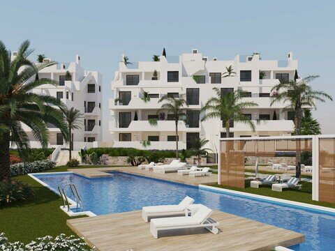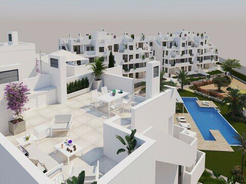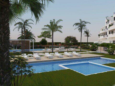 MGP New Homes are delighted to offer for sale these brand new apartments located on Santa Rosalia Lake & Life Resort in Murcia. The development occupies an elevated positon at the top of this popular resort. The apartments have an exclusive communal swimming pool area with childrens pool, play area, outdoor exercise area and sunbathing spaces. There is also underground parking. This apartment is on the first floor and comprises an open-plan living room with modern kitchen, two bedrooms, two bathrooms, a terrace with views over the pool area and an additional small terrace. These are selling quickly so please get in touch asap if you wish to reserve.