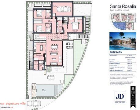 MGP Golf & Coastal Properties are delighted to offer for sale this brand new villa being constructed 100m from the Crystal Lagoon at Santa Rosalia Lake & Life Resort. The villa offers spacious accommodation on a single storey with a 65 sq'm solarium terrace above and huge 145 sq'm basement which could be used for extra bedrooms, cinema room, gym etc. The villa is situated on a large sunny corner plot The ground floor comprises a spacious living room with doors opening to the garden, large fitted contemporary kitchen leading to the laundry room. There is a fantastic master bedroom suite, two guests suites, WC and garage. Steps lead down to the basement area and to the solarium terrace above. Outside there is a store room, shower room and a private swimming pool. The villa has ducted air-conditioning, underfloor heating in the bathrooms and the basement is finished ready for use. Contact MGP to arrange a tour of this fantastic new resort concept.