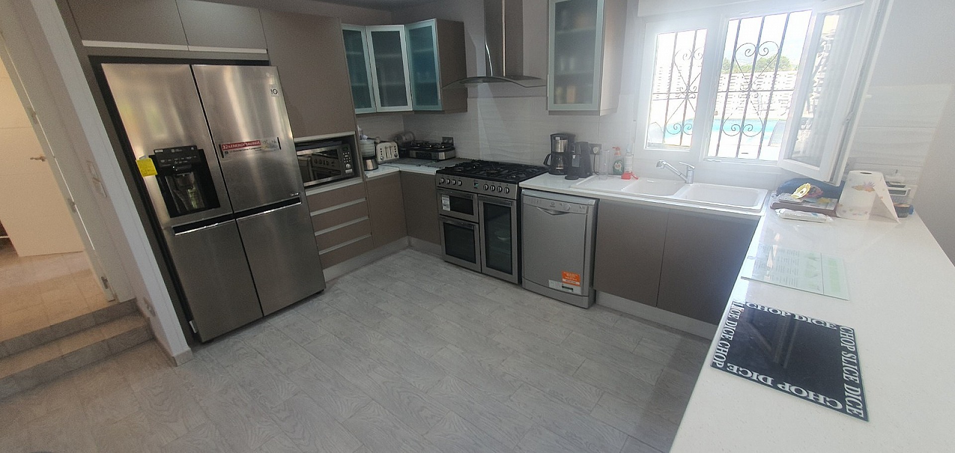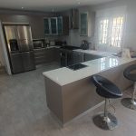 We have a large open plan lounge and ding room separated from a modern kitchen by an American style bar. The kitchen has attractive units, plenty of work’s space, large range style oven and hob, American fridge, ceiling spotlights, and under unit coloured LED.