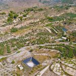 The plot has many diferent trees which are all watered by a huge water deposit with an irrigation system.