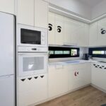 Inside, the villa features a bright open-plan living and dining area with a fully fitted kitchen, two bedrooms, and two bathrooms. One of the bedrooms includes a small office area and an ensuite guest toilet, making it ideal for remote working or as a multifunctional space.