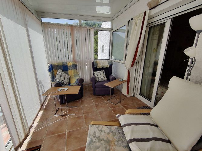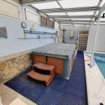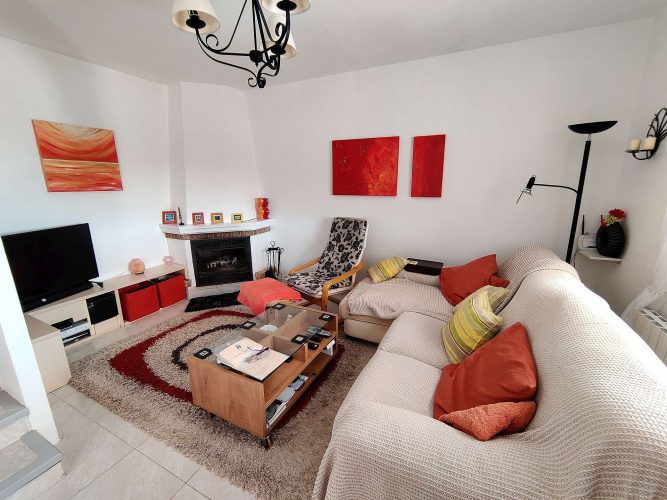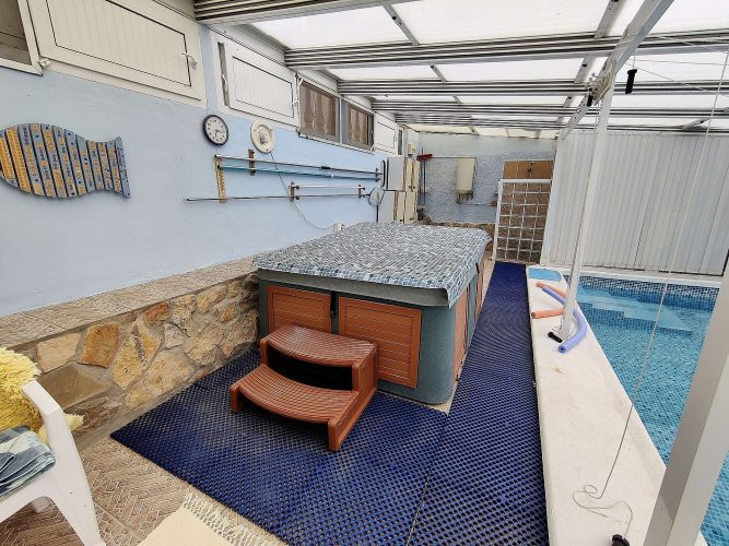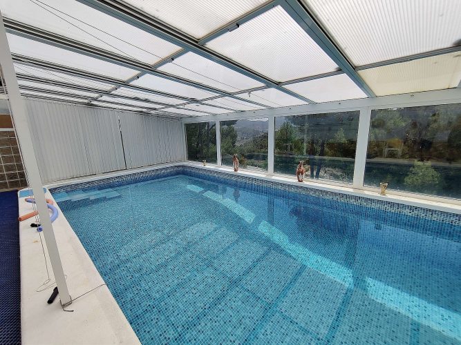 There is also a large covered terrace and open terrace with great views of the mountains and countryside. Downstairs is the lounge-dining room and kitchen, with another bathroom slightly up the stairs. There is also a partially covered terrace overlooking the mountains and the bottom garden. Below this floor there is an empty space ideal for making a studio, there is plenty of height and an ideal place to make a door entrance. A bit further down some steps is the swimming pool, which is covered and can be used all year around, with a retractable roof. There is also a shower and a hot tub which is included. The plot size is approx 1300m2, and there is mains water, electricity and a soak away septic tank which has never had to be emptied. Good wireless internet. Furniture included.